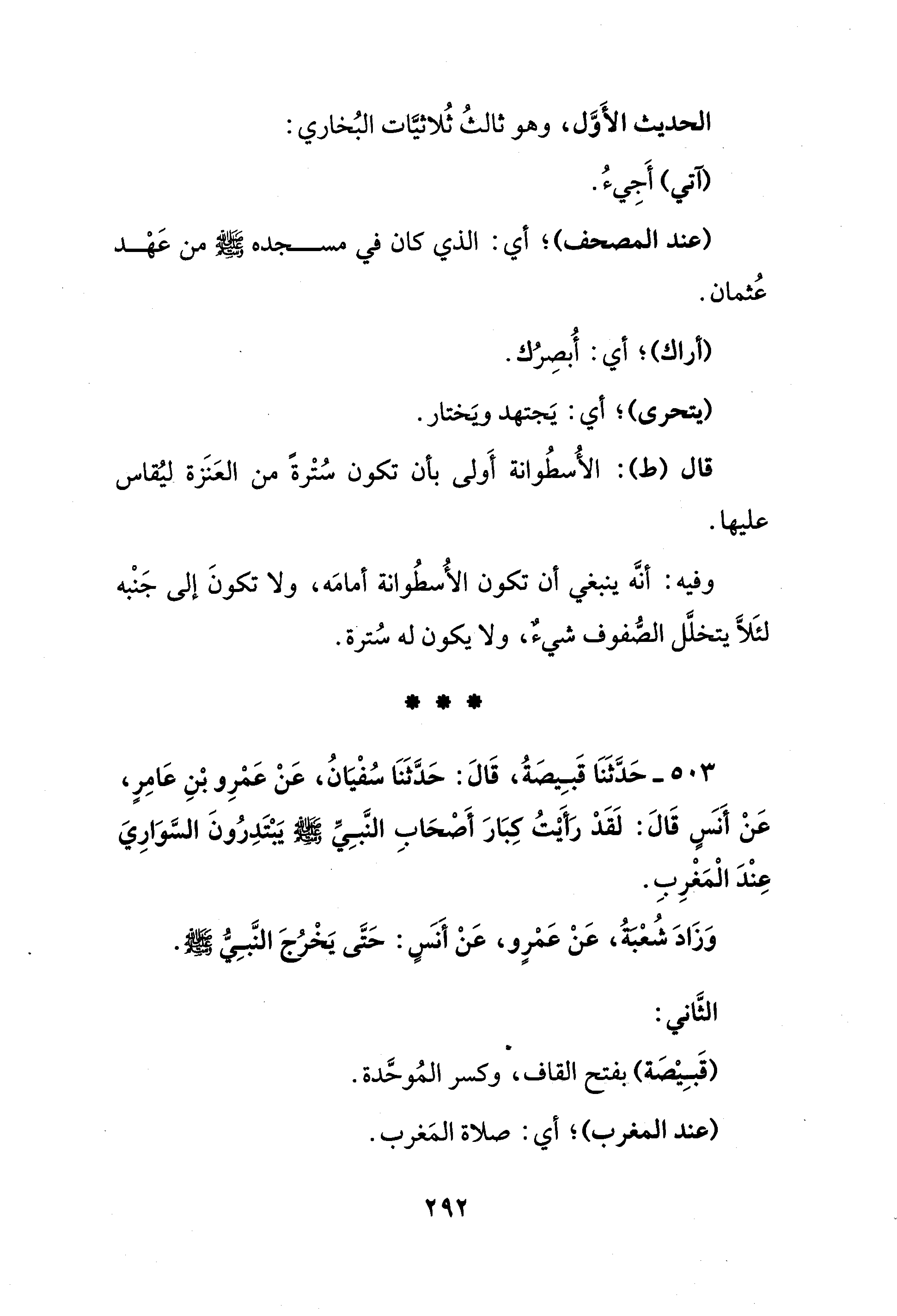 503 - حَدَّثَنَا قَبِيصَةُ، قَالَ: حَدَّثَنَا سُفْيَانُ، عَنْ عَمْرِو بْنِ عَامِرٍ، عَنْ أَنسٍ قَالَ: لَقَدْ رَأَيْتُ كبَارَ أَصْحَابِ النَّبِيِّ - صلى الله عليه وسلم - يَبْتَدِرُونَ السَّوَارِيَ عِنْدَ الْمَغْرِبِ.