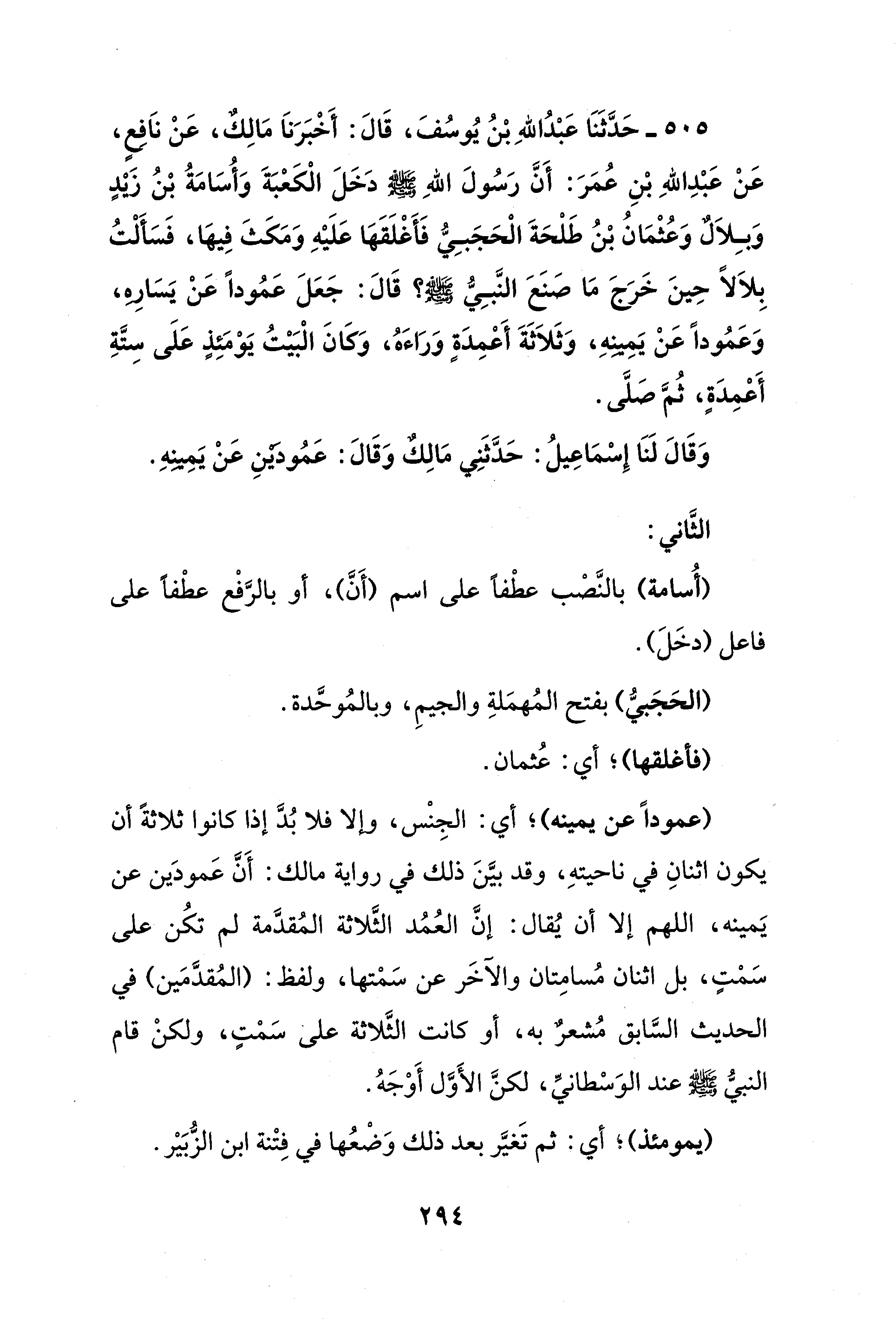 505 - حَدَّثَنَا عَبْدُ اللهِ بْنُ يُوسُفَ، قَالَ: أَخْبَرَناَ مَالِكٌ، عَنْ ناَفعٍ، عَنْ عَبدِ اللهِ بْنِ عُمَرَ: أَنَّ رَسُولَ اللهِ - صلى الله عليه وسلم - دخل الكعبة وأسامةُ بْنُ زيدٍ وَبِلاَلٌ وَعُثْمَانُ بْنُ طَلْحَةَ الْحَجَبِيُّ فَأَغْلَقَهَا عَلَيْهِ وَمَكَثَ فِيهَا، فَسَأَلْتُ بِلاَلًا حِينَ خَرَجَ مَا صَنع النَّبِيُّ - صلى الله عليه وسلم -؟ قَالَ: جَعَلَ عَمُودًا عَنْ يَسَارِه، وَعَمُودًا عَنْ يَمِينهِ، وَثَلاَثَةَ أَعْمِدَةٍ وَرَاءَهُ، وَكَانَ الْبَيْتُ يَوْمَئِذٍ عَلَى سِتَّةِ أَعْمِدَةٍ، ثُمَّ صَلَّى.
