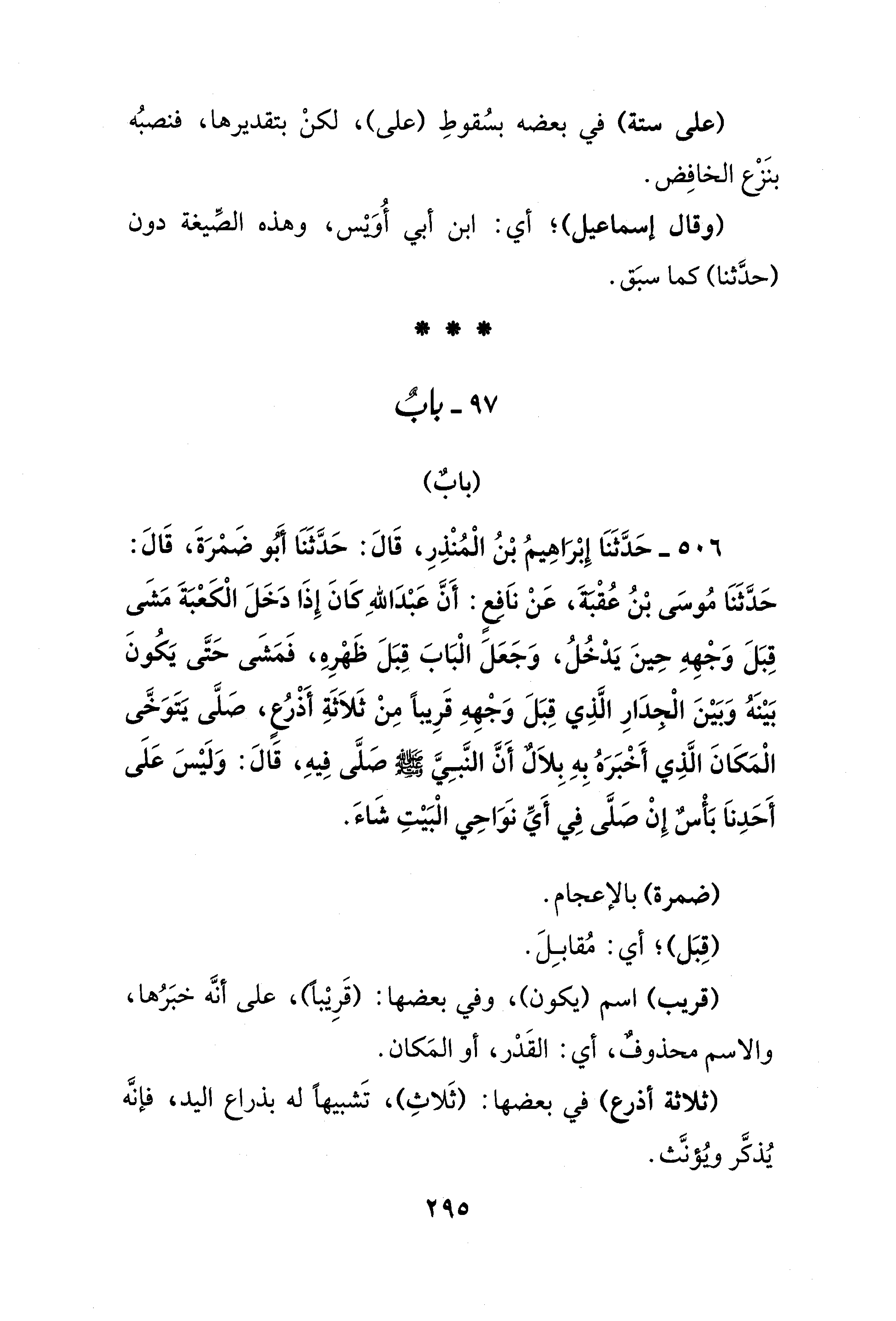 506 - حَدَّثَنَا إِبْرَاهِيمُ بْنُ الْمُنْذِرِ، قَالَ: حَدَّثَنَا أبُو ضَمْرَةَ، قَالَ: حَدَّثَنَا مُوسَى بْنُ عُقْبَةَ، عَنْ ناَفِعٍ: أَنَّ عَبْدَ اللهِ كَانَ إِذَا دَخَلَ الْكَعْبَةَ مَشَى قِبَلَ وَجْهِهِ حِينَ يَدْخُلُ، وَجَعَلَ الْبَابَ قِبَلَ ظَهْرِهِ، فَمَشَى حَتَّى يَكُونَ بَيْنَهُ وَبَيْنَ الْجِدَارِ الَّذِي قِبَلَ وَجْهِهِ قَرِيبًا مِنْ ثَلاَثَةِ أَذْرُعٍ، صَلَّى يتوَخَّى الْمَكَانَ الَّذِي أَخْبَرَهُ بِهِ بِلاَلٌ أَنَّ النَّبِيَّ - صلى الله عليه وسلم - صَلَّى فِيهِ، قَالَ: وَلَيْسَ عَلَى أَحَدِنَا بَأسٌ إِنْ صَلَّى في أَيِّ نَوَاحِي الْبَيْتِ شَاءَ.