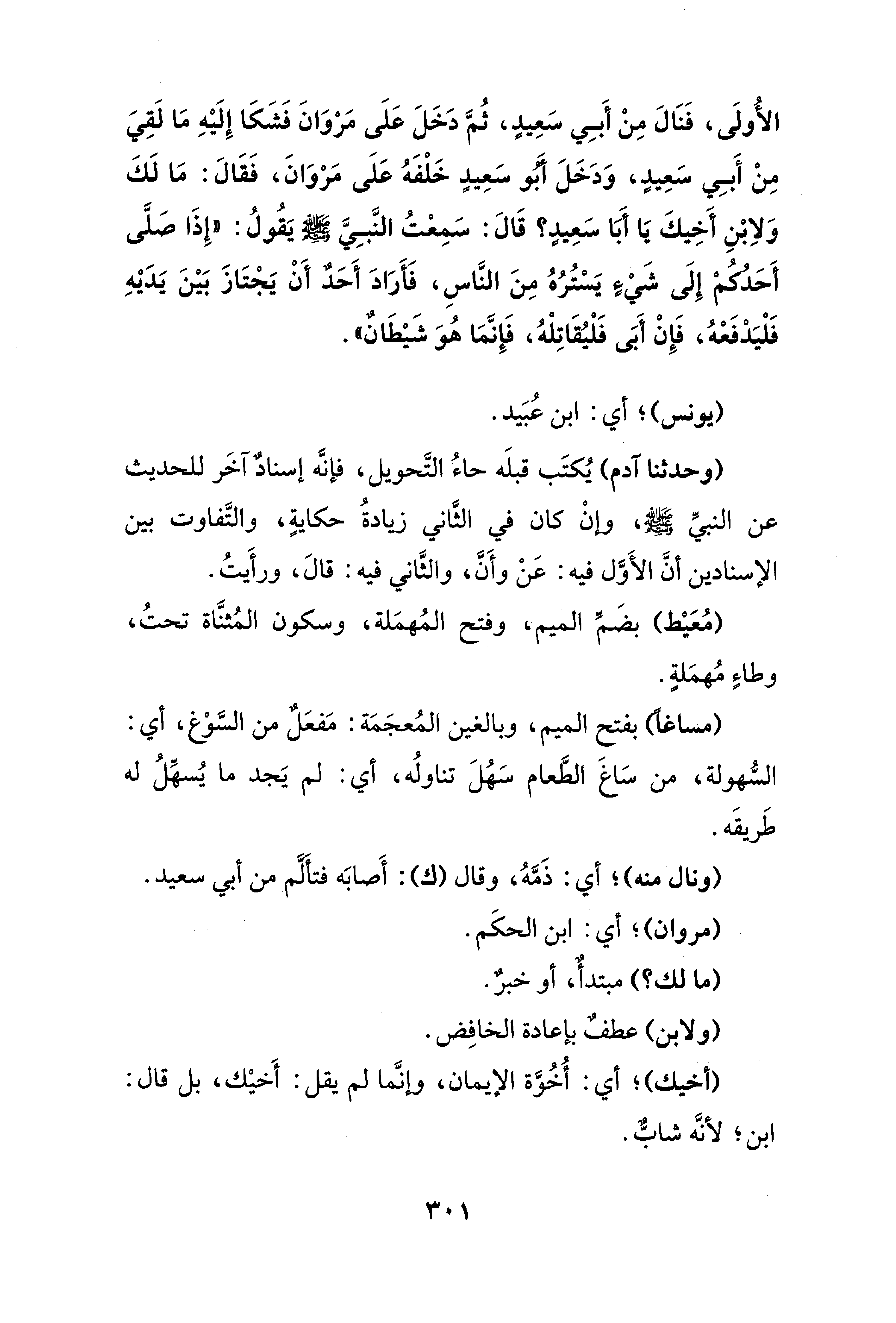 الأُولَى، فَنَالَ مِنْ أَبِي سَعِيدٍ، ثُمَّ دَخَلَ عَلَى مَرْوَانَ فَشَكَا إِلَيْهِ مَا لَقِيَ مِنْ أَبِي سَعِيدٍ، وَدَخَلَ أَبُو سَعِيدٍ خَلْفَهُ عَلَى مَرْوَانَ، فَقَالَ: مَا لَكَ وَلاِبْنِ أَخِيكَ يَا أَبَا سَعِيدٍ؟ قَالَ: سَمِعْتُ النَّبِيَّ - صلى الله عليه وسلم - يَقُولُ: "إِذَا صَلَّى أَحَدُكُمْ إِلَى شَيْءٍ يَسْتُرُهُ مِنَ النَّاسِ، فَأَرَادَ أَحَدٌ أَنْ يَجْتَازَ بَيْنَ يَدَيْهِ فَلْيَدْفَعْهُ، فَإنْ أبَى فَلْيُقَاتِلْهُ، فَإِنَّمَا هُوَ شَيْطَانٌ".