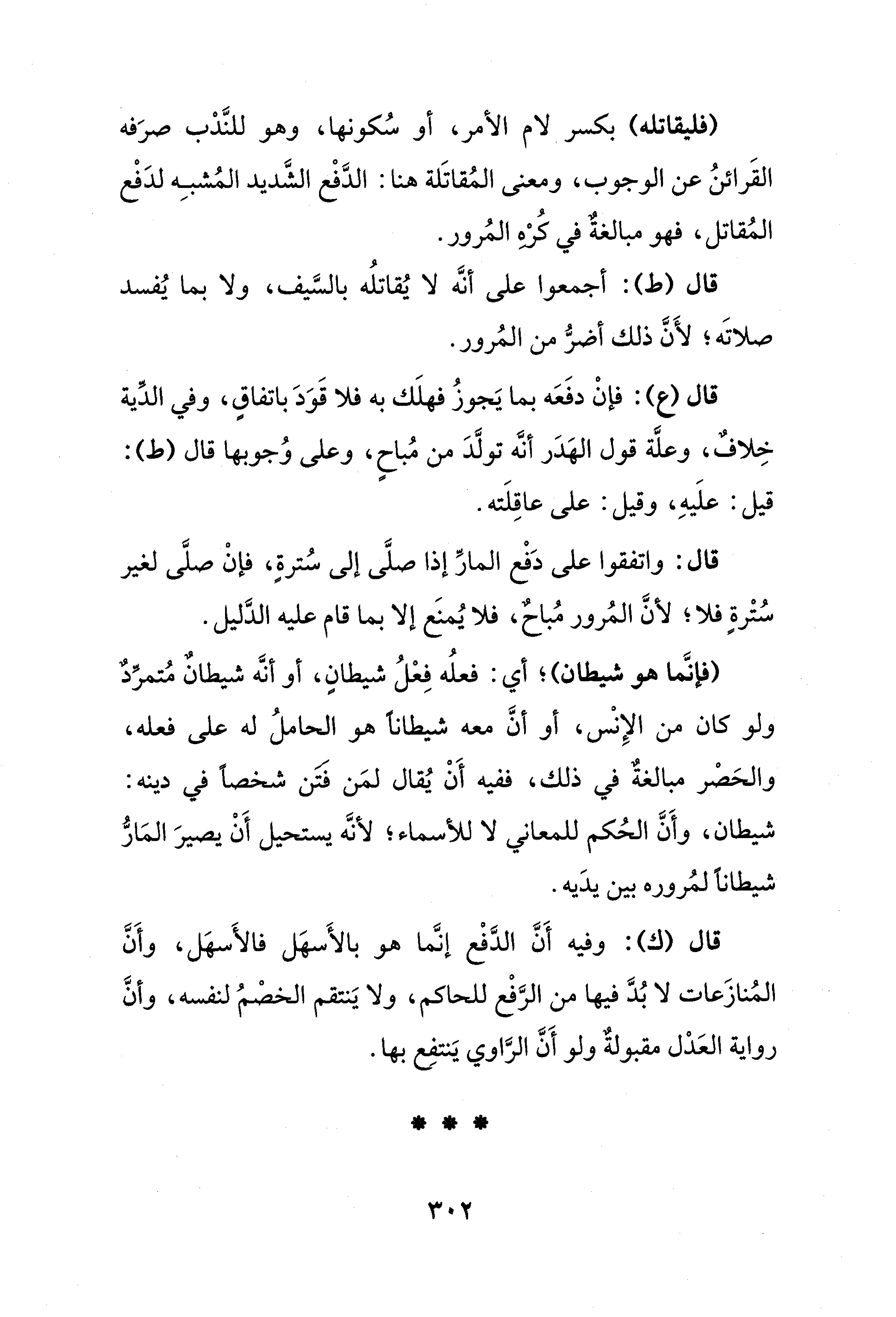 قال (ط): أجمعوا على أنَّه لا يُقاتلُه بالسَّيف، ولا بما يُفسد صلاتَه؛ لأَنَّ ذلك أضرُّ من المُرور.