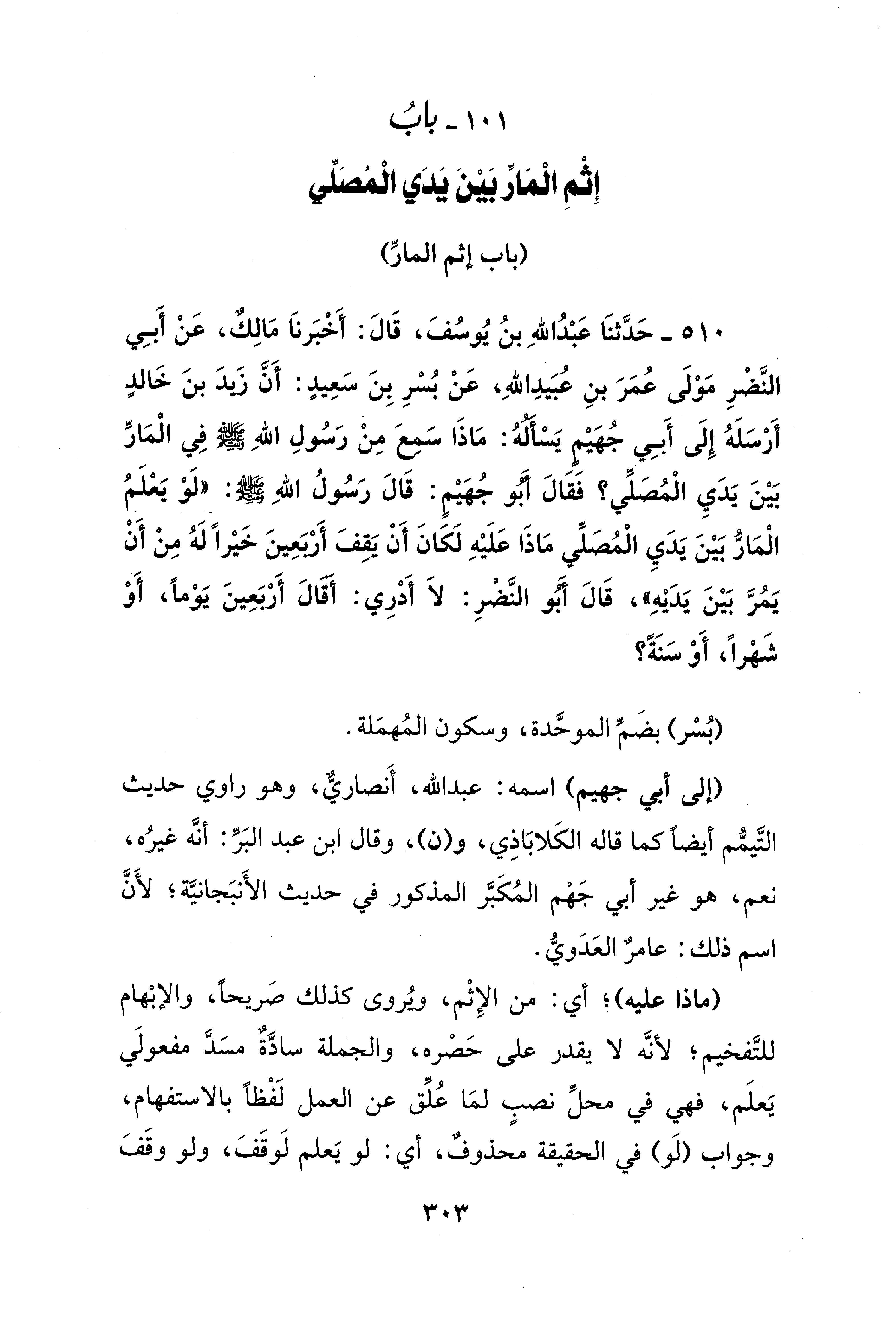 510 - حَدَّثنَا عَبْدُ اللهِ بنُ يُوسُفَ، قَالَ: أَخْبَرناَ مَالِكٌ، عَنْ أَبِي النَّضْرِ مَوْلَى عُمَرَ بنِ عُبَيدِ اللهِ، عَنْ بُسْرِ بِنَ سَعِيدٍ: أَنَّ زَيدَ بنَ خَالدٍ أَرْسَلَهُ إِلَى أَبِي جُهَيْمِ يَسْأَلُهُ: مَاذَا سَمِعَ مِنْ رَسُولِ اللهِ - صلى الله عليه وسلم - في الْمَارِّ بَيْنَ يَدَيِ الْمُصَلِّي؟ فَقالَ أَبُو جُهَيْمٍ: قَالَ رَسُولُ اللهِ - صلى الله عليه وسلم -: "لَوْ يَعْلَمُ الْمَارُّ بَيْنَ يَدَيِ الْمُصَلِّي مَاذَا عَلَيْهِ لَكَانَ أَنْ يَقِفَ أَرْبَعِينَ خَيْرًا لَهُ مِنْ أَنْ يَمُرَّ بَيْنَ يَدَيْهِ"، قَالَ أَبُو النَّضْرِ: لاَ أَدْرِي: أقالَ أَرْبَعِينَ يَوْمًا، أَوْ شَهْرًا، أَوْ سَنَةً؟