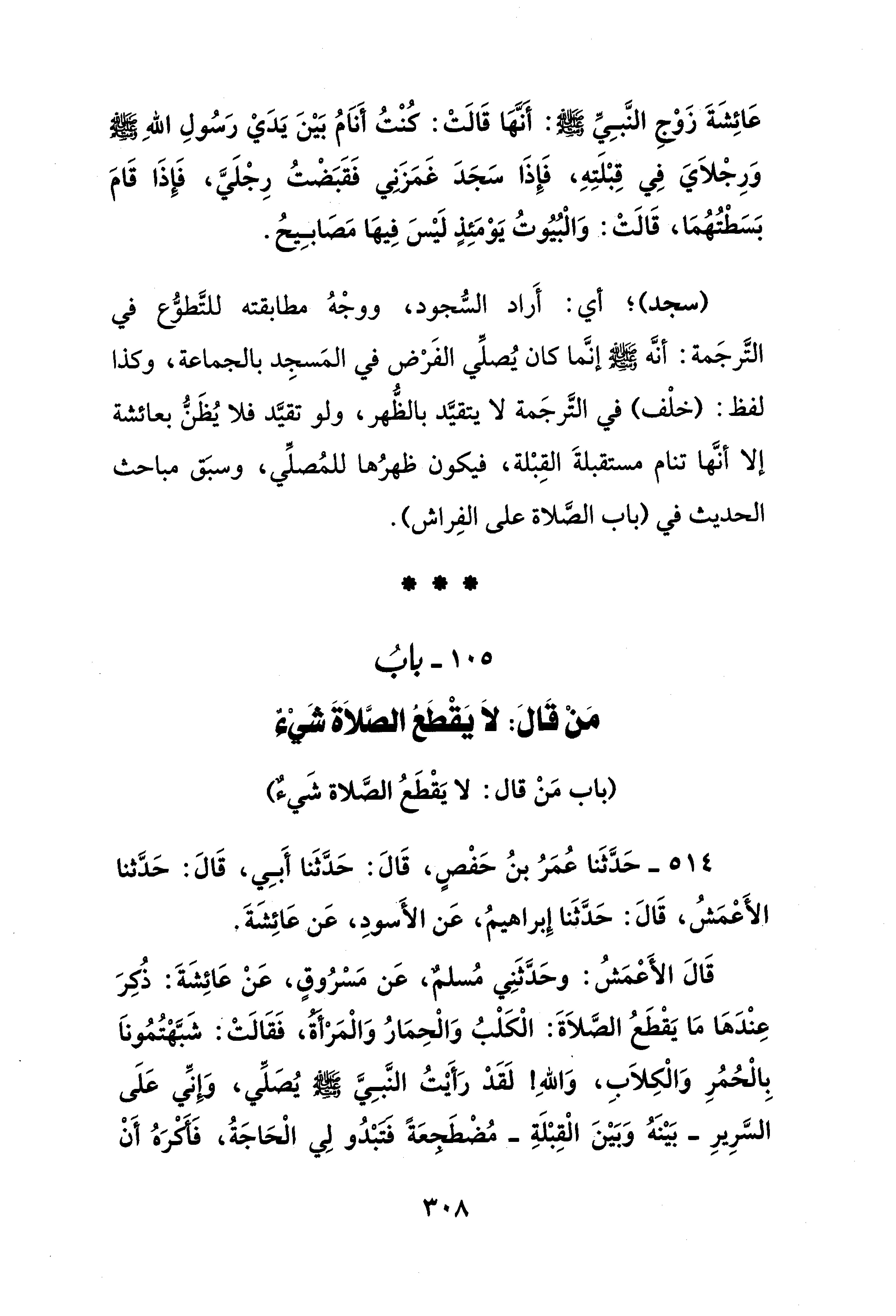 105 - بابُ مَنْ قَالَ: لاَ يَقْطَعُ الصَّلاَةَ شَيْءٌ