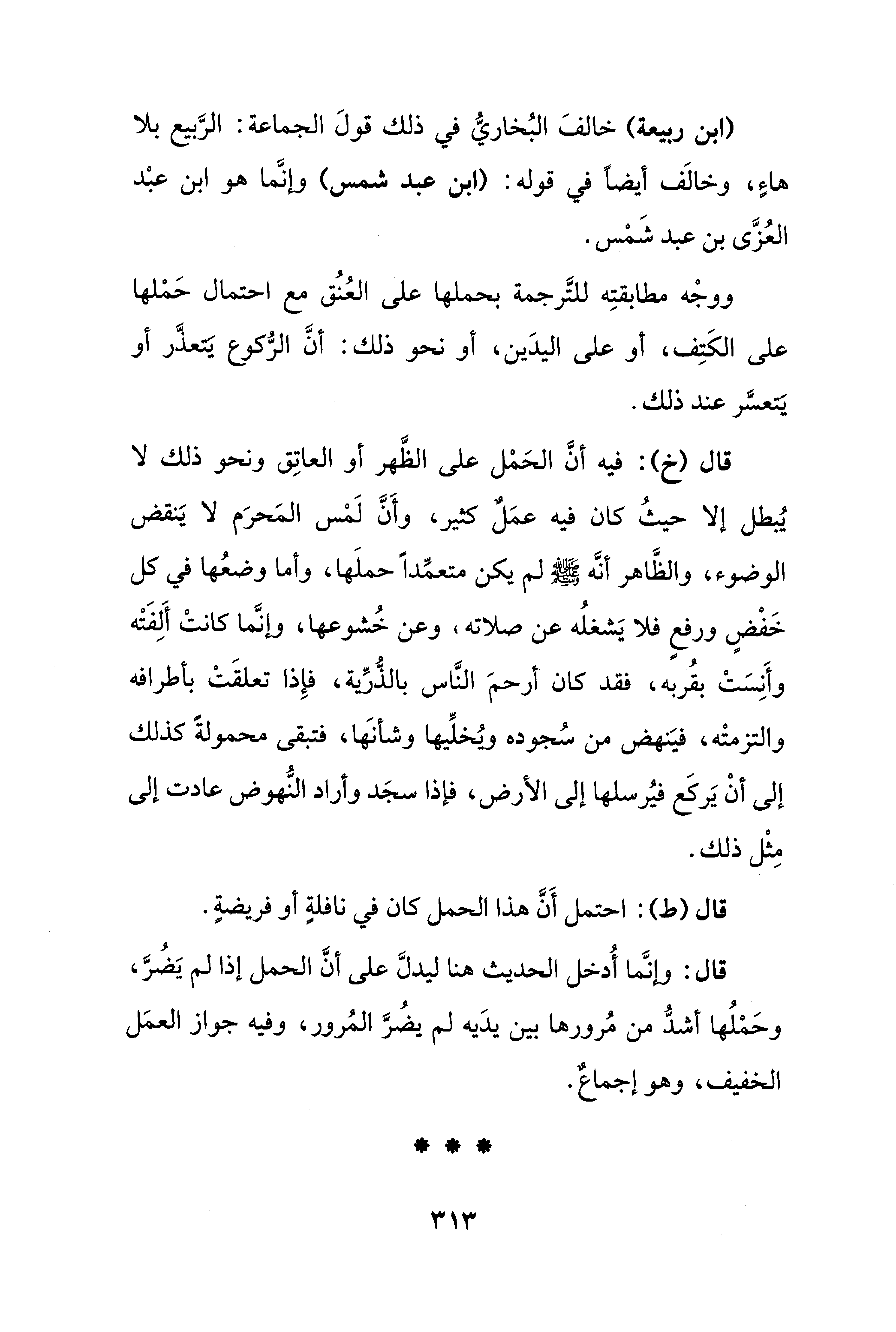 قال (خ): فيه أنَّ الحَمْل على الظَّهر أو العاتِق ونحو ذلك لا يُبطل إلا حيثُ كان فيه عمَلٌ كثير، وأَنَّ لَمْس المَحرَم لا يَنقض الوضوء، والظَّاهر أنَّه - صلى الله عليه وسلم - لم يكن متعمِّدًا حملَها، وأما وضعُها في كل خَفْضٍ ورفعٍ فلا يَشغلُه عن صلاته، وعن خُشوعها، وإِنَّما كانتْ أَلِفَتْه وأَنِسَتْ بقُربه، فقد كان أرحمَ النَّاس بالذُّرِّية، فإِذا تعلقَتْ بأطرافه والتزمتْه، فيَنهض من سُجوده ويُخلِّيها وشأنَها، فتبقى محمولةً كذلك إلى أنْ يَركَع فيُرسلها إلى الأرض، فإذا سجَد وأراد النُّهوض عادت إلى مِثْل ذلك.