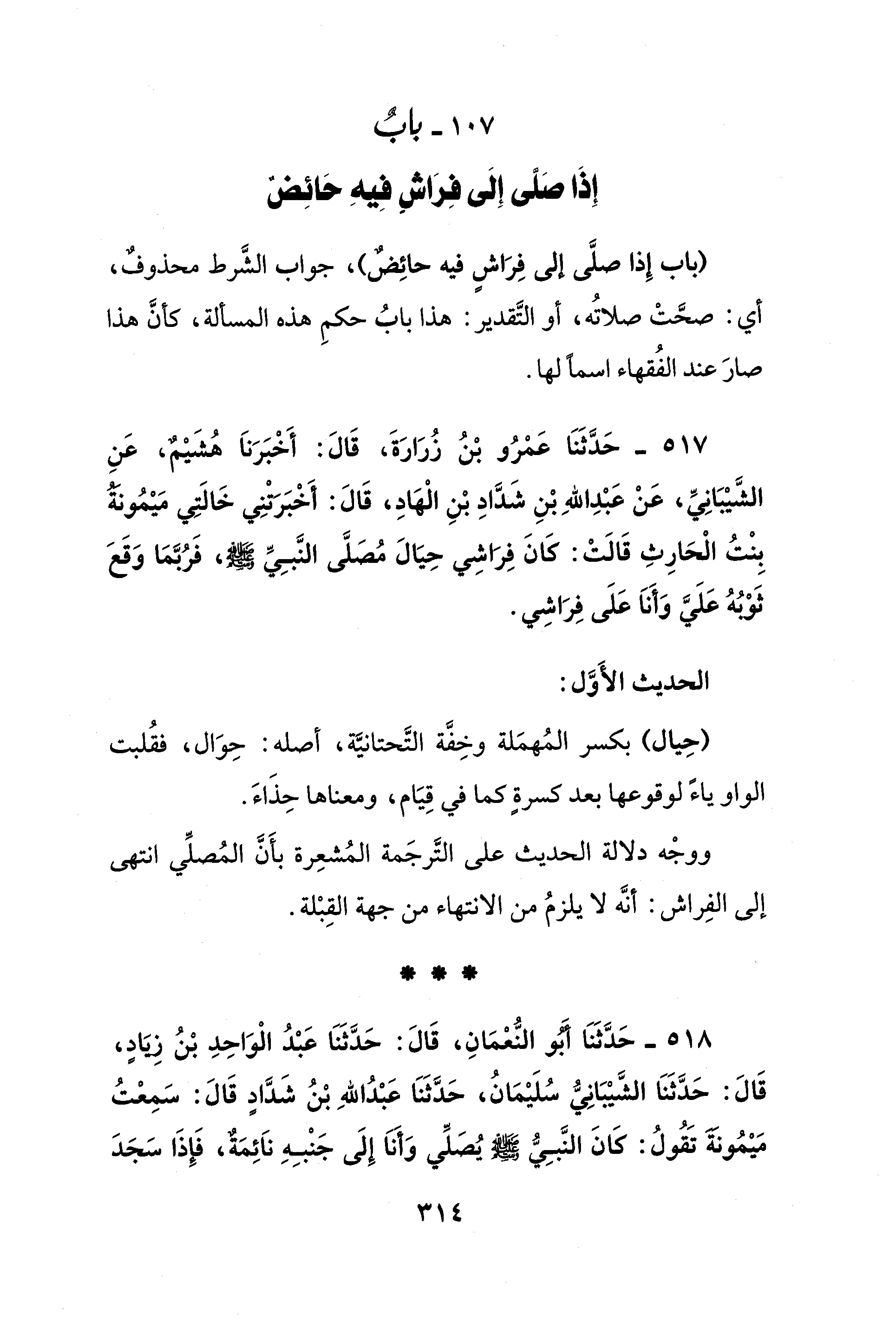 107 - بابٌ إِذَا صَلَّى إِلَى فِرَاشٍ فِيهِ حَائِضٌ