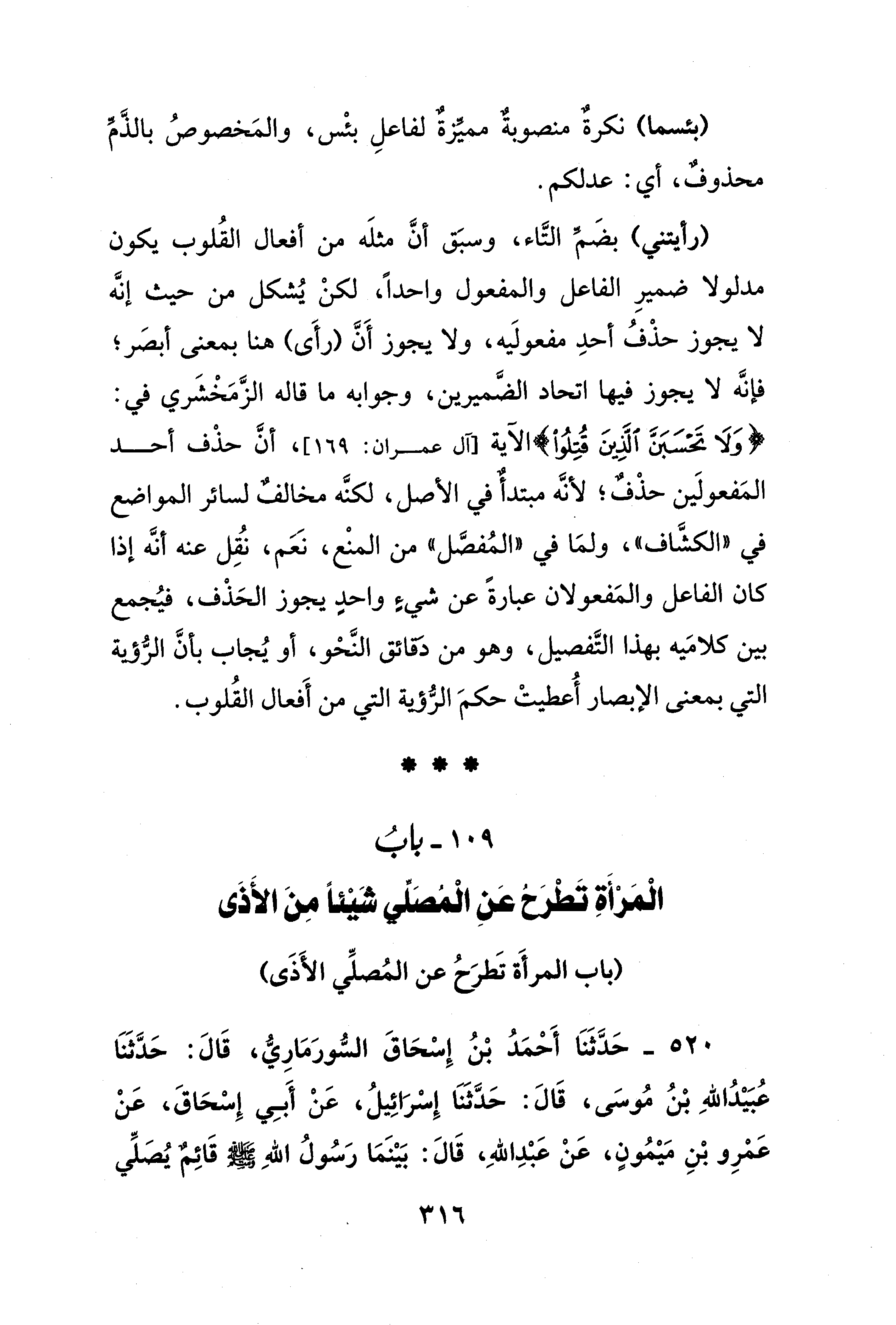 (رأيتني) بضَمِّ التَّاء، وسبَق أنَّ مثلَه من أفعال القُلوب يكون مدلولا ضميرِ الفاعل والمفعول واحدًا، لكنْ يُشكل من حيث إنَّه لا يجوز حذْفُ أحدِ مفعولَيه، ولا يجوز أَنَّ (رأَى) هنا بمعنى أبصَر؛ فإنَّه لا يجوز فيها اتحاد الضَّميرين، وجوابه ما قاله الزَّمَخْشَري في: {وَلَا تَحْسَبَنَّ الَّذِينَ قُتِلُوا} الآية [آل عمران: 169]، أنَّ حذْف أحد المَفعولَين حذْفٌ؛ لأنَّه مبتدأٌ في الأصل، لكنَّه مخالفٌ لسائر المواضع في "الكشَّاف"، ولمَا في "المُفصَّل" من المنْع، نَعَم، نُقِل عنه أنَّه إذا كان الفاعل والمَفعولان عبارةً عن شيءٍ واحدٍ يجوز الحَذْف، فيُجمع بين كلامَيه بهذا التَّفصيل، وهو من دَقائق النَّحْو، أو يُجاب بأنَّ الرُّؤية التي بمعنى الإبصار أُعطيتْ حكمَ الرُّؤية التي من أَفعال القُلوب.
