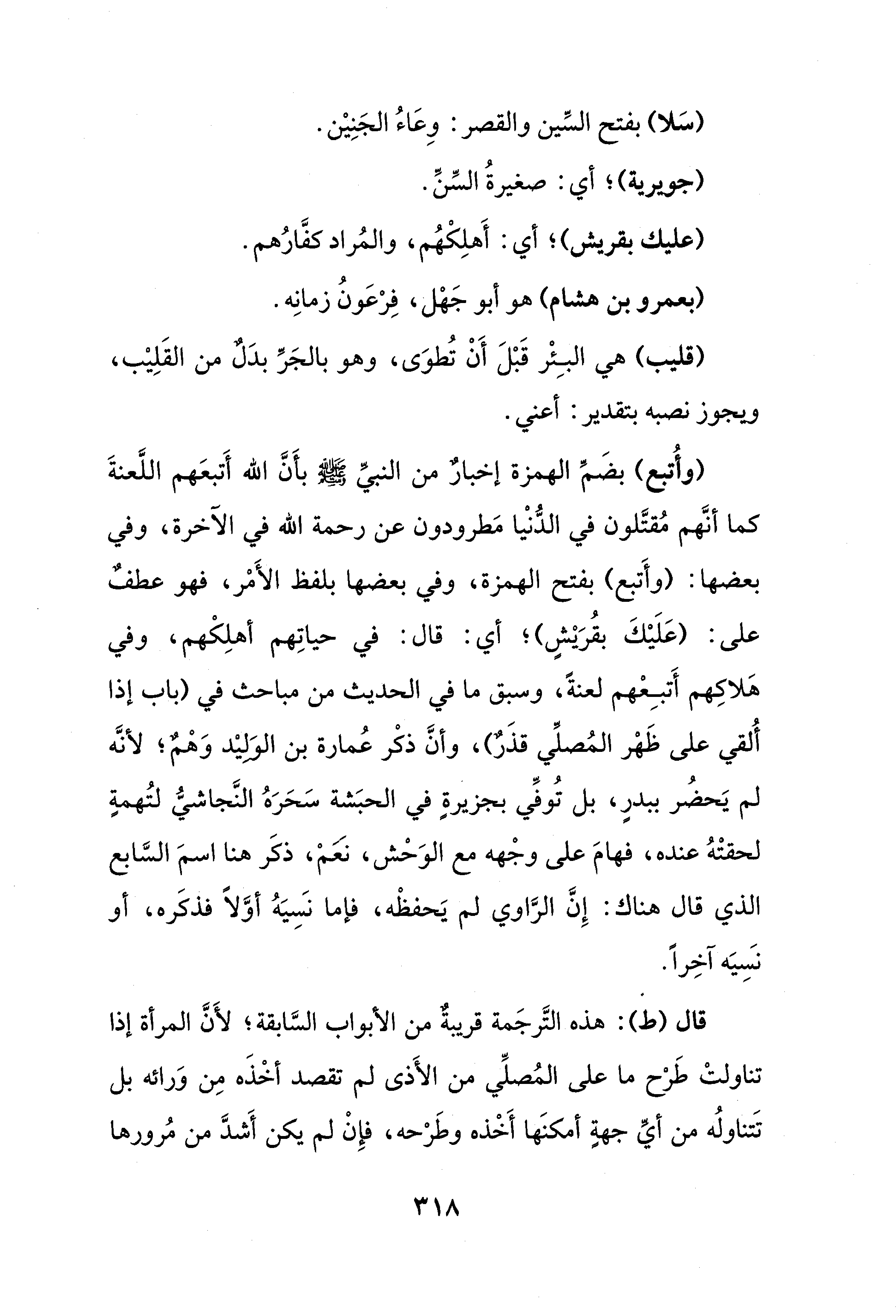 (وأُتبع) بضَمِّ الهمزة إخبارٌ من النبيِّ - صلى الله عليه وسلم - بأَنَّ الله أَتبعَهم اللَّعنةَ كما أنَّهم مُقتَّلون في الدُّنْيا مَطرودون عن رحمة الله في الآخرة، وفي بعضها: (وأَتبع) بفتح الهمزة، وفي بعضها بلفظ الأَمْر، فهو عطفٌ على: (عَلَيْكَ بقُرَيْشٍ)؛ أي: قال: في حياتِهم أهلِكْهم، وفي هَلاكِهم أَتبِعْهم لعنةً، وسبق ما في الحديث من مباحث في (باب إذا أُلقي على ظَهْر المُصلِّي قذَرٌ)، وأنَّ ذكْر عُمارة بن الوَلِيْد وَهْمٌ؛ لأنَّه لم يَحضُر ببدرٍ، بل تُوفِّي بجزيرةٍ في الحبَشة سَحَرَهُ النَّجاشيُّ لتُهمةٍ لحقتْهُ عنده، فهامَ على وجْهه مع الوَحْش، نَعَمْ، ذكَر هنا اسمَ السَّابع الذي قال هناك: إِنَّ الرَّاوي لم يَحفظْه، فإما نَسِيَهُ أوَّلًا فذكَره، أو نسِيَه آخِرًا.