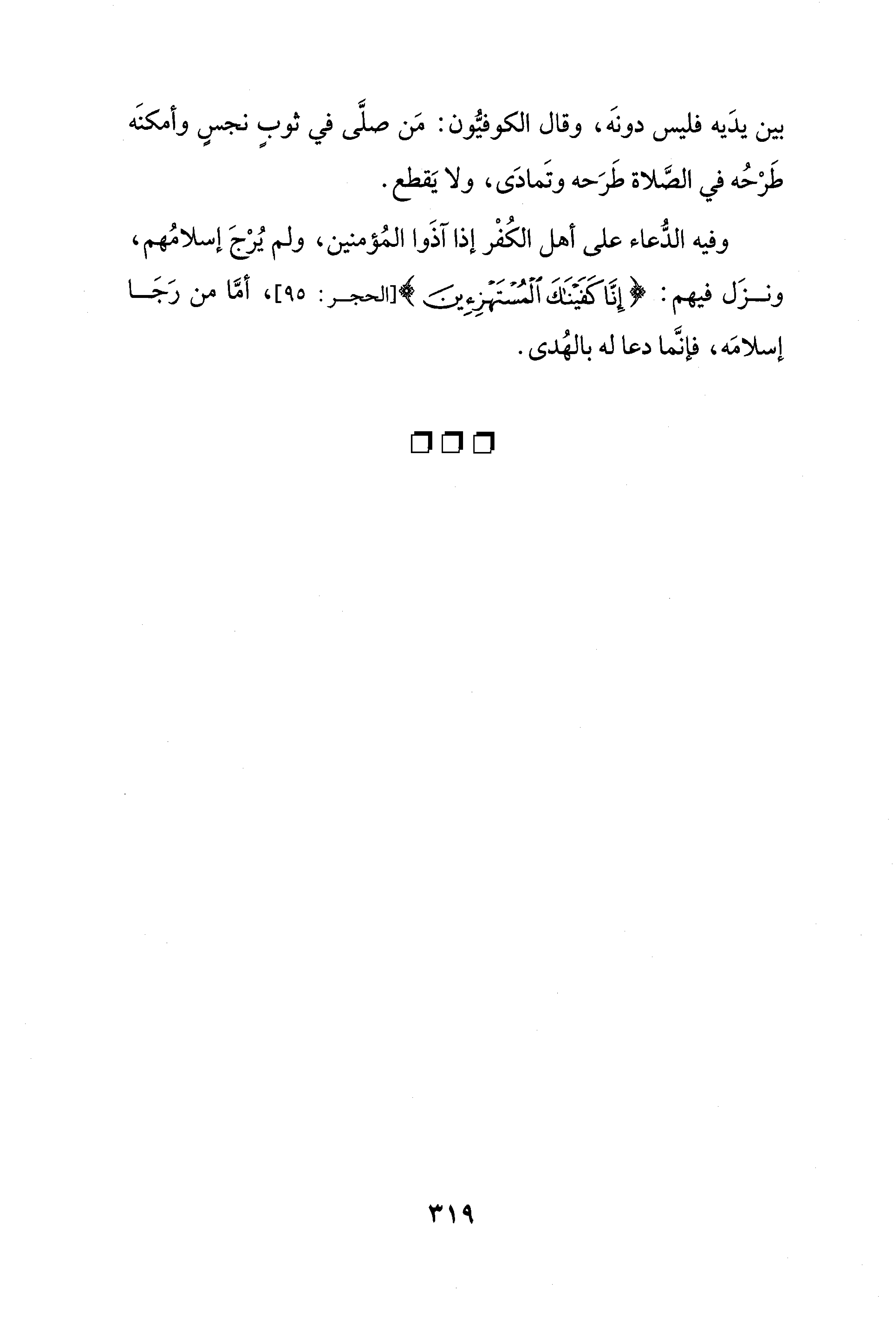 وفيه الدُّعاء على أهل الكُفْر إذا آذَوا المُؤمنين، ولم يُرْجَ إسلامُهم، ونزَل فيهم: {إِنَّا كَفَيْنَاكَ الْمُسْتَهْزِئِينَ} [الحجر: 95]، أمَّا من رَجَا إسلامَه، فإنَّما دعا له بالهُدى.
