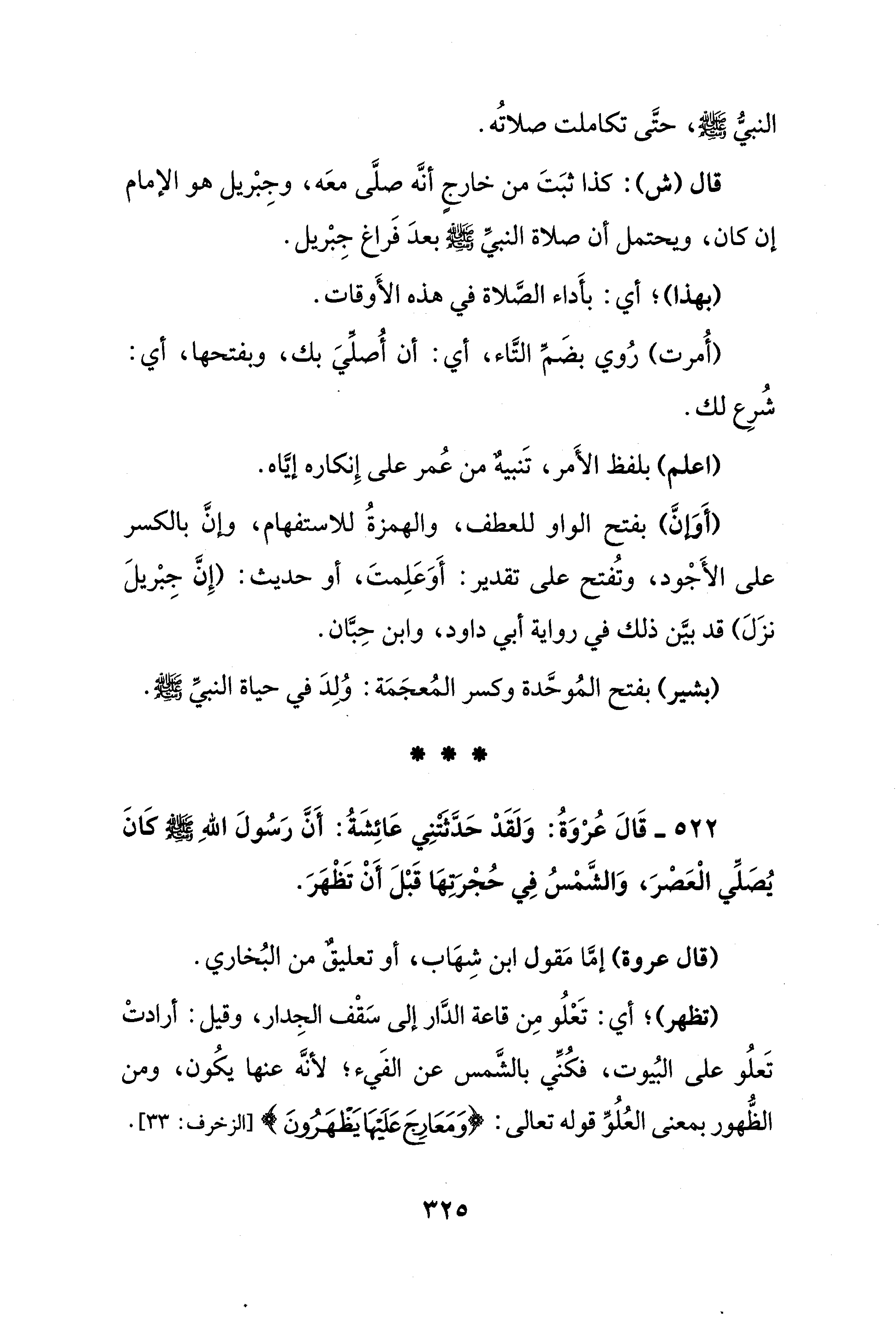522 - قَالَ عُرْوَةُ: وَلَقَدْ حَدَّثتنِي عَائِشَةُ: أَنَّ رَسُولَ اللهِ - صلى الله عليه وسلم - كَانَ يُصَلِّي الْعَصْرَ، وَالشَّمْسُ في حُجْرَتِهَا قَبْلَ أَنْ تَظْهَرَ.