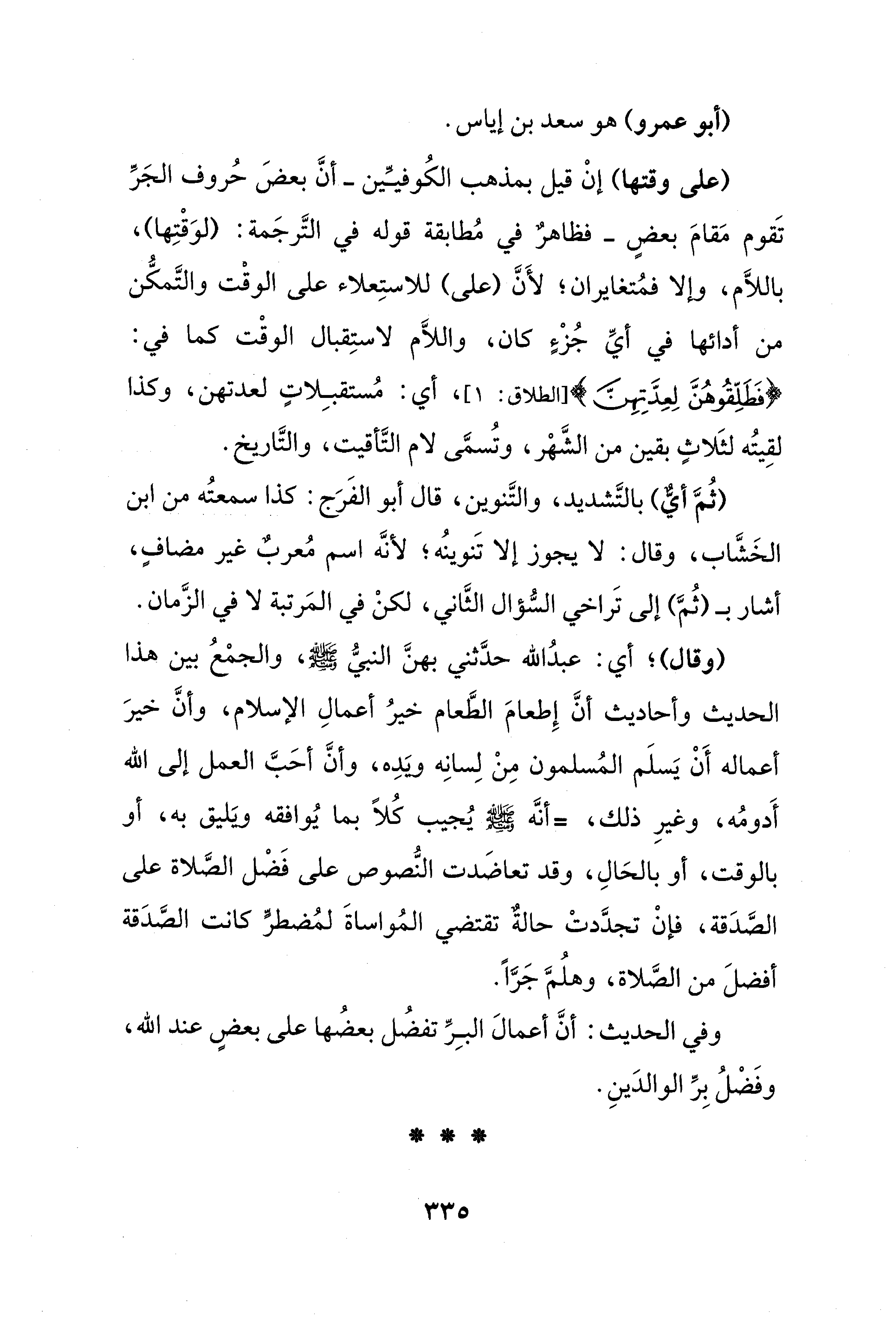 وفي الحديث: أنَّ أعمالَ البِرِّ تفضُل بعضُها على بعضٍ عند الله، وفَضْلُ بِرِّ الوالدَينِ.