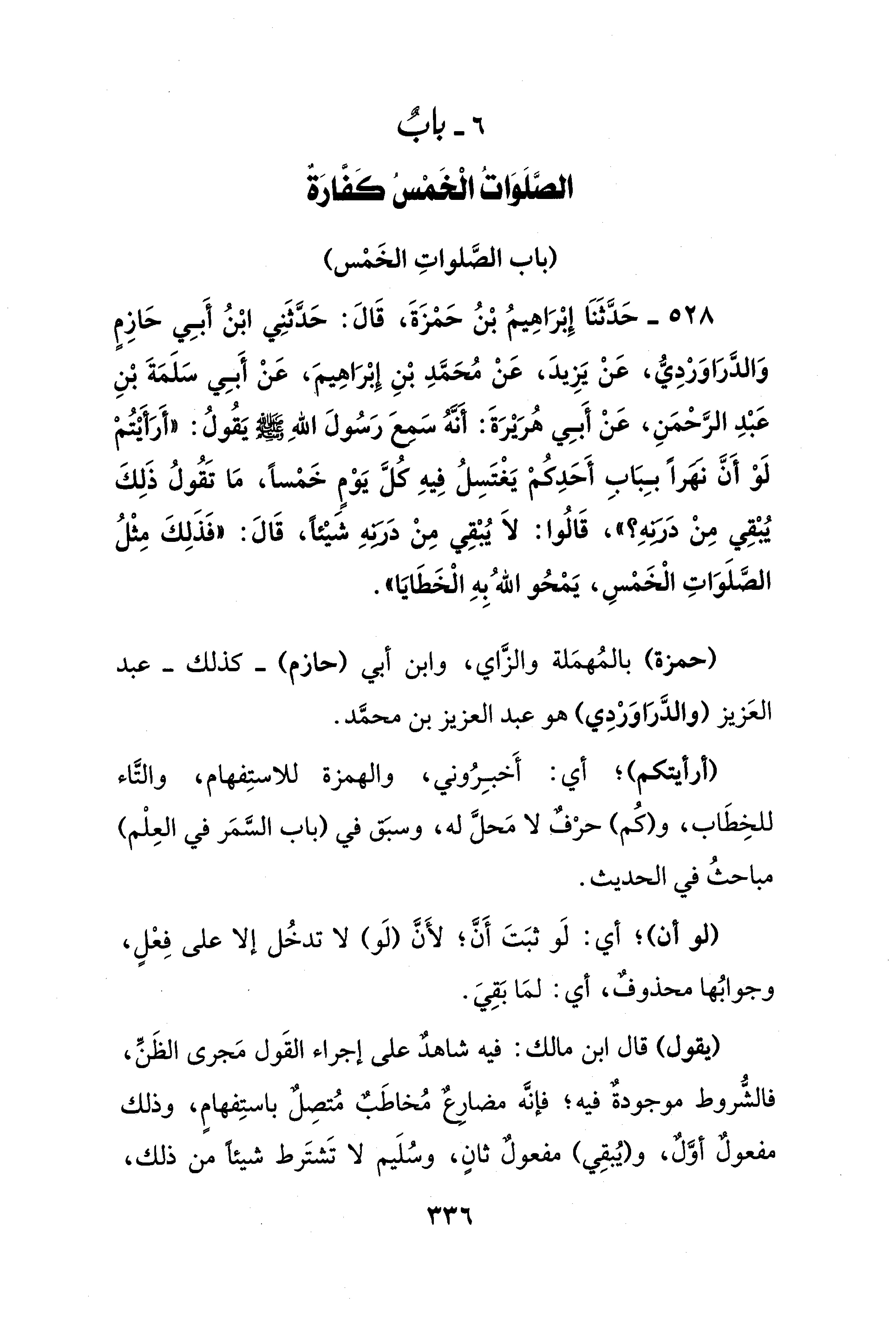 528 - حَدَّثَنَا إِبْرَاهِيمُ بْنُ حَمْزَةَ، قَالَ: حَدَّثَنِي ابْنُ أَبِي حَازِمٍ وَالدَّرَاوَرْدِيُّ، عَنْ يَزِيدَ، عَنْ مُحَمَّدِ بْنِ إِبْرَاهِيمَ، عَنْ أَبِي سَلَمَةَ بْنِ عَبْدِ الرَّحْمَنِ، عَنْ أَبِي هُرَيرَةَ: أَنَّهُ سَمعَ رَسُولَ اللهِ - صلى الله عليه وسلم - يَقُولُ: "أَرَأَيتُمْ لَوْ أَنَّ نهرًا بِبَابِ أَحَدِكُمْ يَغْتَسِلُ فِيهِ كُلَّ يَوْمٍ خَمْسًا، مَا تَقُولُ ذَلِكَ يُبْقِي مِنْ دَرَنِهِ؟ "، قَالُوا: لاَ يُبْقِي مِنْ دَرَنِهِ شَيْئًا، قَالَ: "فَذَلِكَ مِثْلُ الصَّلَوَاتِ الْخَمْسِ، يَمْحُو اللهُ بِهِ الْخَطَايَا".