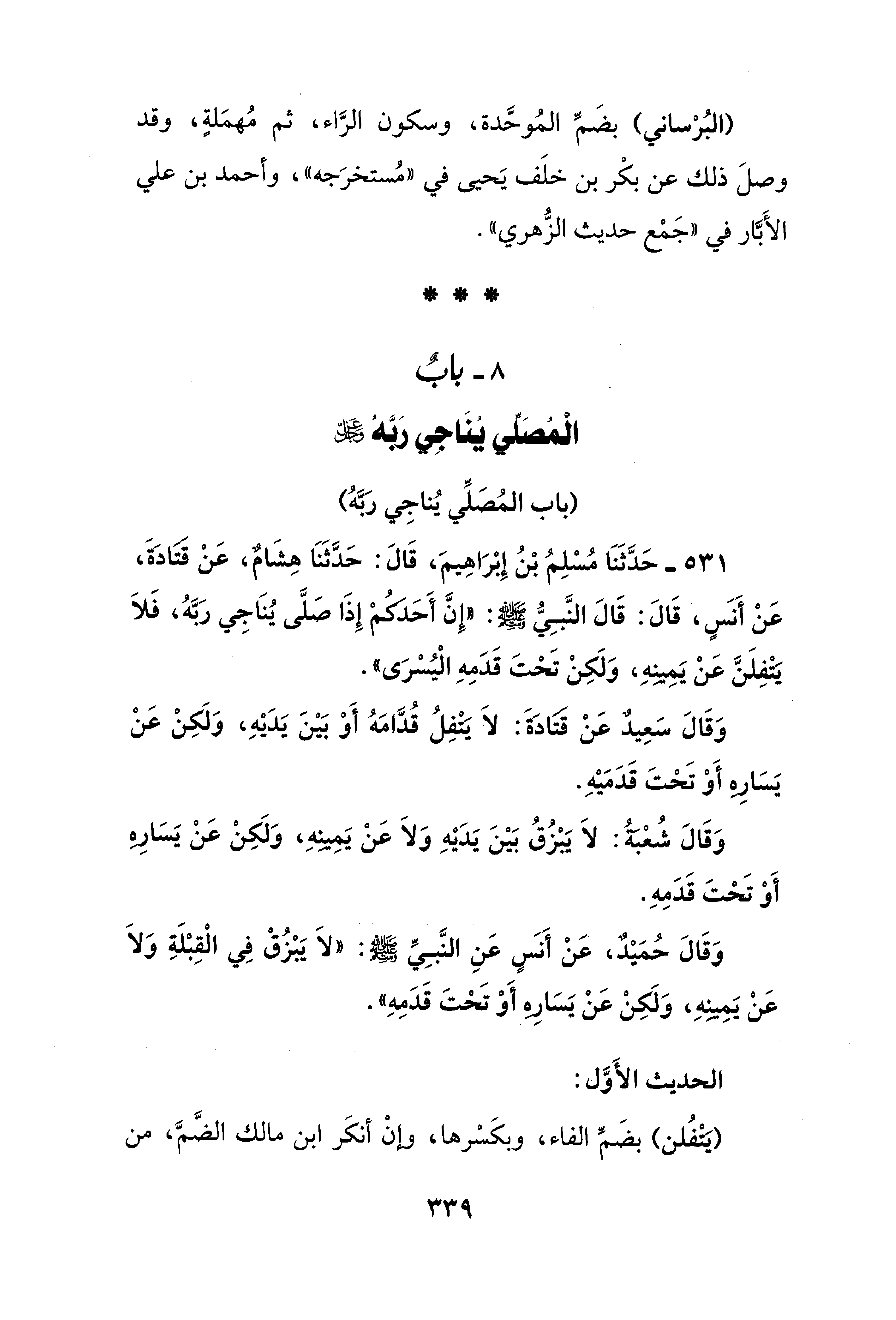 531 - حَدَّثَنَا مُسْلِمُ بْنُ إِبْرَاهِيمَ، قَالَ: حَدَّثَنَا هِشَامٌ، عَنْ قَتَادَةَ، عَنْ أَنسٍ، قَالَ: قَالَ النَّبِيُّ - صلى الله عليه وسلم -: "إِنَّ أَحَدَكُمْ إِذَا صَلَّى يُنَاجِي رَبَّهُ، فَلاَ يَتْفِلَنَّ عَنْ يَمِينِهِ، وَلَكِنْ تَحْتَ قَدَمِهِ الْيُسْرَى".