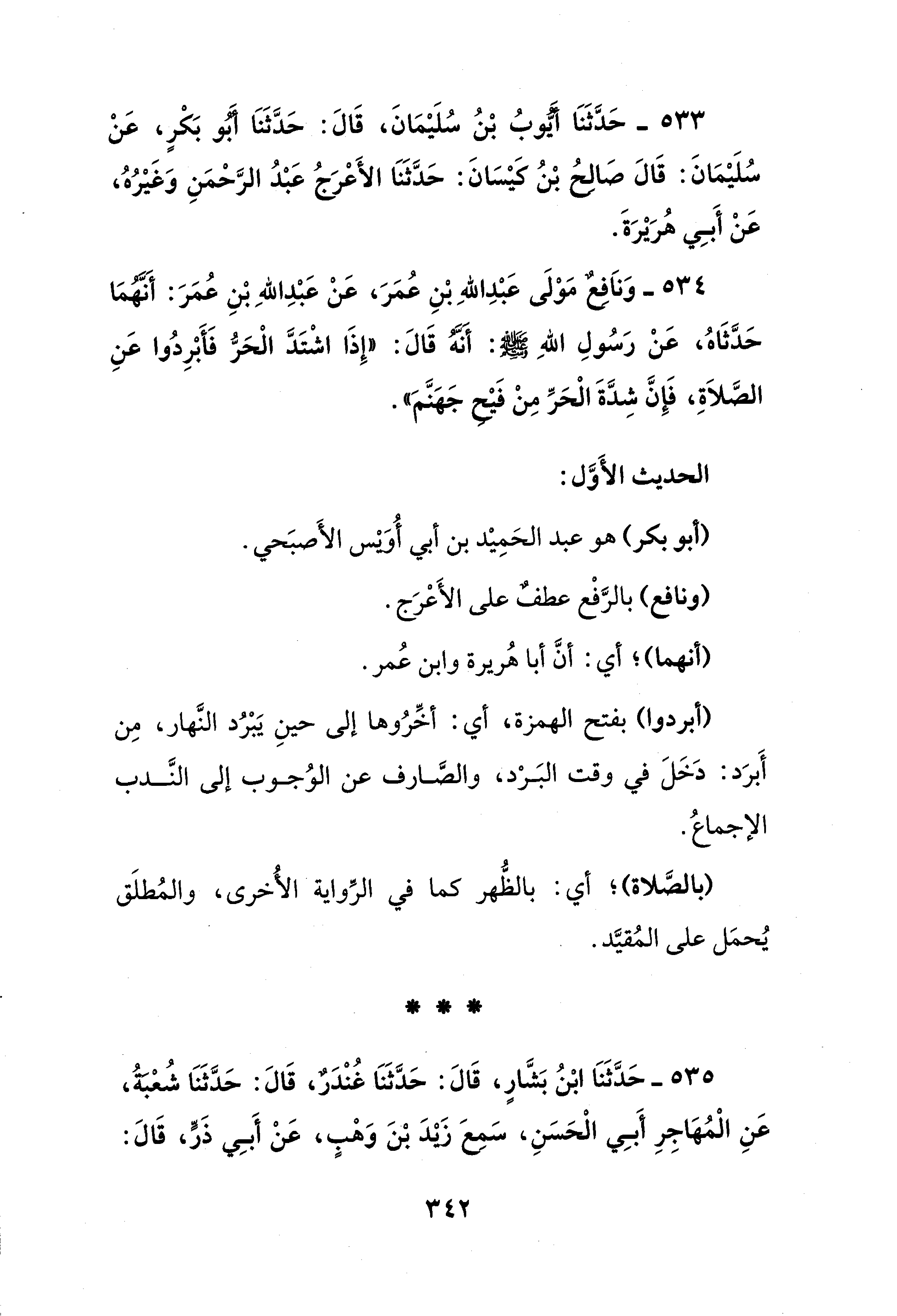 534 - وَناَفِعٌ مَوْلَى عَبْدِ اللهِ بْنِ عُمَرَ، عَنْ عَبْدِ اللهِ بْنِ عُمَرَ: أَنَّهُمَا حَدَّثَاهُ، عَنْ رَسُولِ اللهِ - صلى الله عليه وسلم -: أنَّهُ قَالَ: "إِذَا اشْتَدَّ الْحَرُّ فَأَبْرِدُوا عَنِ الصَّلاَةِ، فَإِنَّ شِدَّةَ الْحَرِّ مِنْ فَيْحِ جَهَنَّمَ".