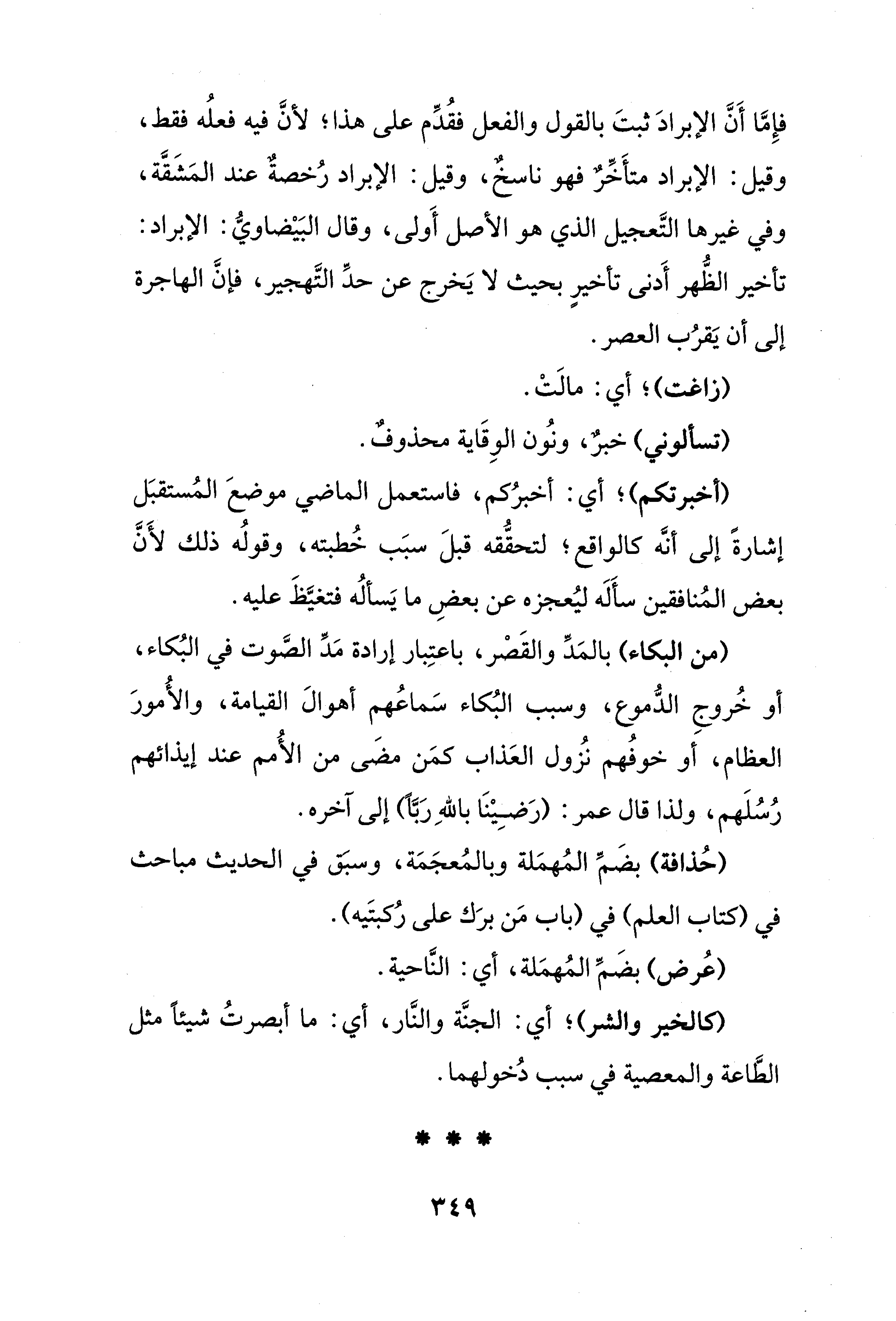 فإِمَّا أَنَّ الإبرادَ ثبتَ بالقول والفعل فقُدِّم على هذا؛ لأنَّ فيه فعلُه فقط، وقيل: الإبراد متأَخِّرٌ فهو ناسخٌ، وقيل: الإبراد رُخصةٌ عند المَشَقَّة، وفي غيرها التَّعجيل الذي هو الأصل أَولى، وقال البَيْضاويُّ: الإبراد: تأخير الظُّهر أَدنى تأخيرٍ بحيث لا يَخرج عن حدِّ التَّهجير، فإنَّ الهاجرة إلى أن يَقرُب العصر.