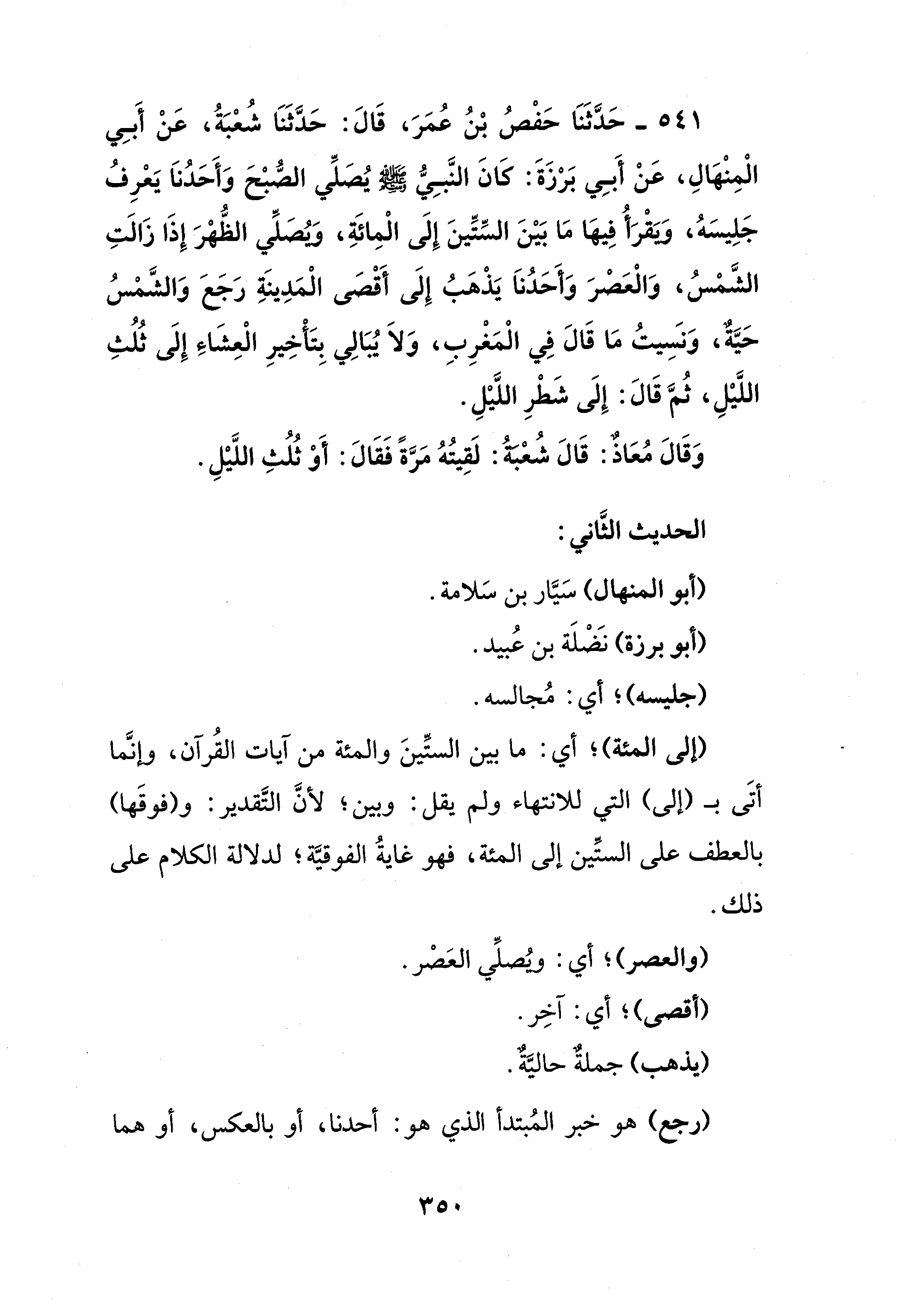541 - حَدَّثَنَا حَفْصُ بْنُ عُمَرَ، قَالَ: حَدَّثَنَا شُعْبَةُ، عَنْ أَبِي الْمِنْهَالِ، عَنْ أَبِي بَرْزَةَ: كَانَ النَّبِيُّ - صلى الله عليه وسلم - يُصَلِّي الصُّبْحَ وَأَحَدُناَ يَعْرِفُ جَلِيسَهُ، وَيَقْرَأُ فِيهَا مَا بَيْنَ السِّتِّينَ إِلَى الْمِائَةِ، ويُصَلِّي الظُّهْرَ إِذَا زَالَتِ الشَّمْسُ، وَالْعَصْرَ وَأَحَدُناَ يَذْهَبُ إِلَى أَقْصَى الْمَدِينَةِ رَجَعَ وَالشَّمْسُ حَيَّةٌ، وَنسَيتُ مَا قَالَ في الْمَغْرِبِ، وَلاَ يُبَالِي بِتَأْخِيرِ الْعِشَاءِ إِلَى ثُلُثِ اللَّيْلِ، ثُمَّ قَالَ: إِلَى شَطْرِ اللَّيْلِ.