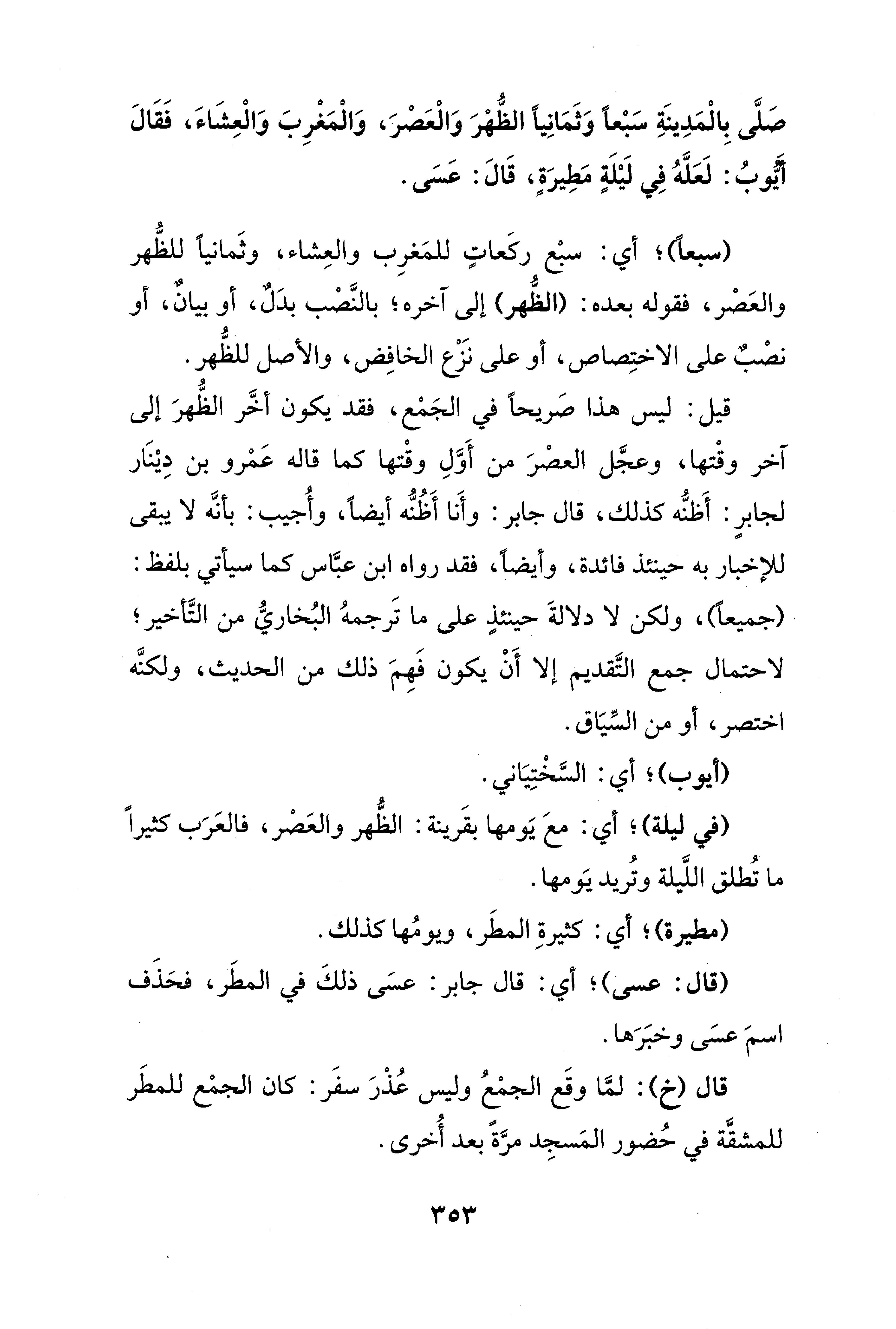 قيل: ليس هذا صَريحًا في الجَمْع، فقد يكون أخَّر الظُّهرَ إلى آخر وقْتها، وعجَّل العصْرَ من أَوَّلِ وقْتها كما قاله عَمْرو بن دِيْنَار لجابرٍ: أَظنُّه كذلك، قال جابر: وأَنا أَظُنُّه أيضًا، وأُجيب: بأنَّه لا يبقى للإخبار به حينئذ فائدة، وأيضًا، فقد رواه ابن عبَّاس كما سيأتي بلفظ: (جميعًا)، ولكن لا دلالةَ حينئذٍ على ما تَرجمهُ البُخاريُّ من التَّأخير؛ لاحتمال جمع التَّقديم إلا أَنْ يكون فَهِمَ ذلك من الحديث، ولكنَّه اختصر، أو من السِّيَاق.
