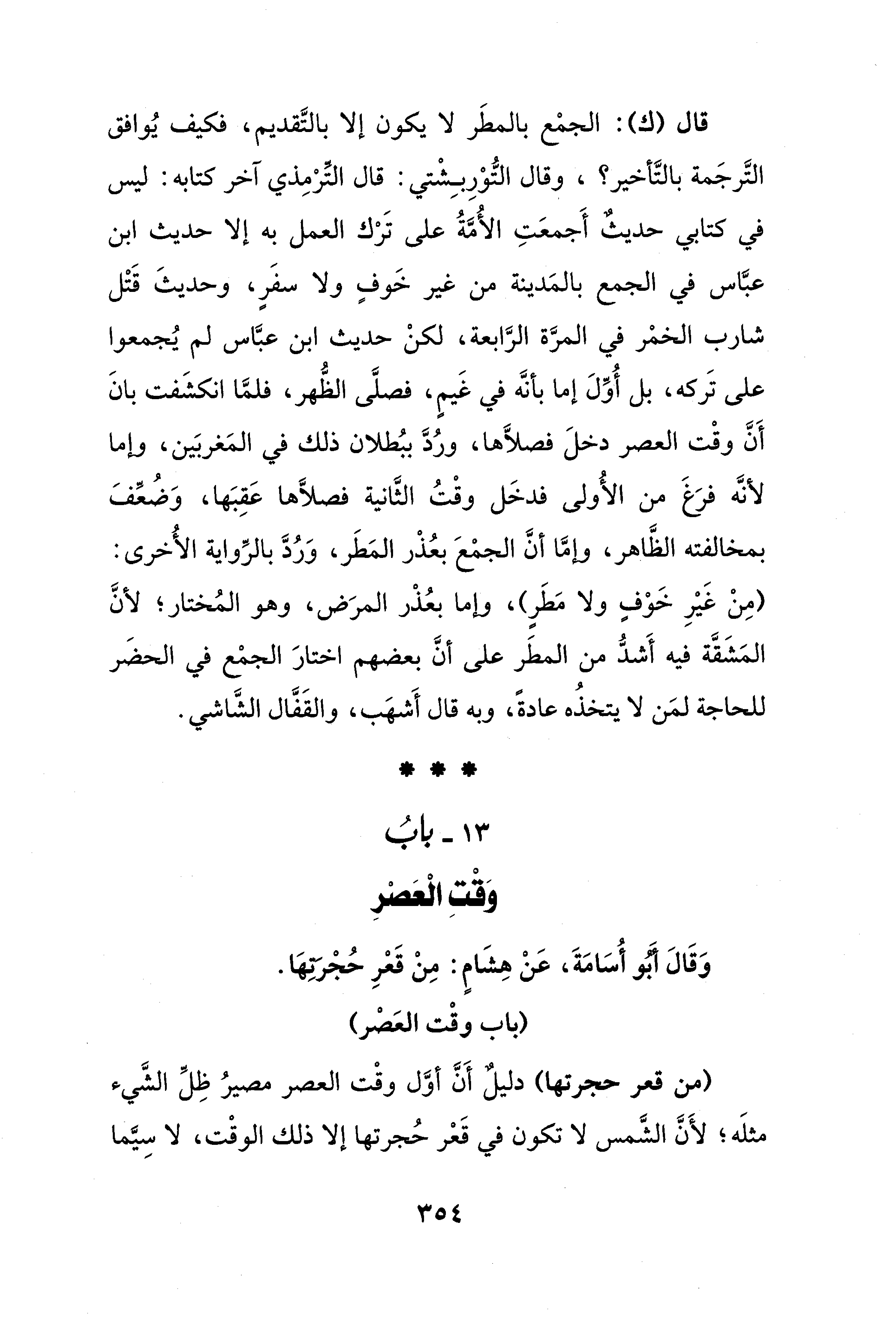 قال (ك): الجمْع بالمطَر لا يكون إلا بالتَّقديم، فكيف يُوافق التَّرجَمة بالتَّأخير؟، وقال التُّوْرِبِشْتي: قال التِّرْمِذي آخر كتابه: ليس في كتابي حديثٌ أَجمعَتِ الأُمَّةُ على تَرْك العمل به إلا حديث ابن عبَّاس في الجمع بالمَدينة من غير خَوفٍ ولا سفَرٍ، وحديثَ قَتْل شارب الخمْر في المرَّة الرَّابعة، لكنْ حديث ابن عبَّاس لم يُجمعوا على تَركه، بل أُوِّلَ إما بأنَّه في غَيمٍ، فصلَّى الظُّهر، فلمَّا انكشَفت بانَ أَنَّ وقْت العصر دخلَ فصلَّاها، ورُدَّ ببُطلان ذلك في المَغربَين، وإما لأنَّه فرَغَ من الأُولى فدخَل وقْتُ الثَّانية فصلَّاها عَقِبَها، وَضُعِّفَ بمخالفته الظَّاهر، وإمَّا أنَّ الجمْعَ بعُذْر المَطَر، وَرُدَّ بالرِّواية الأُخرى: (مِنْ غَيْرِ خَوْفٍ ولا مَطَرٍ)، وإما بعُذْر المرَض، وهو المُختار؛ لأنَّ المَشَقَّة فيه أَشدُّ من المطَر على أنَّ بعضهم اختارَ الجمْع في الحضَر للحاجة لمَن لا يتخذُه عادةً، وبه قال أَشهَب، والقَفَّال الشَّاشي.