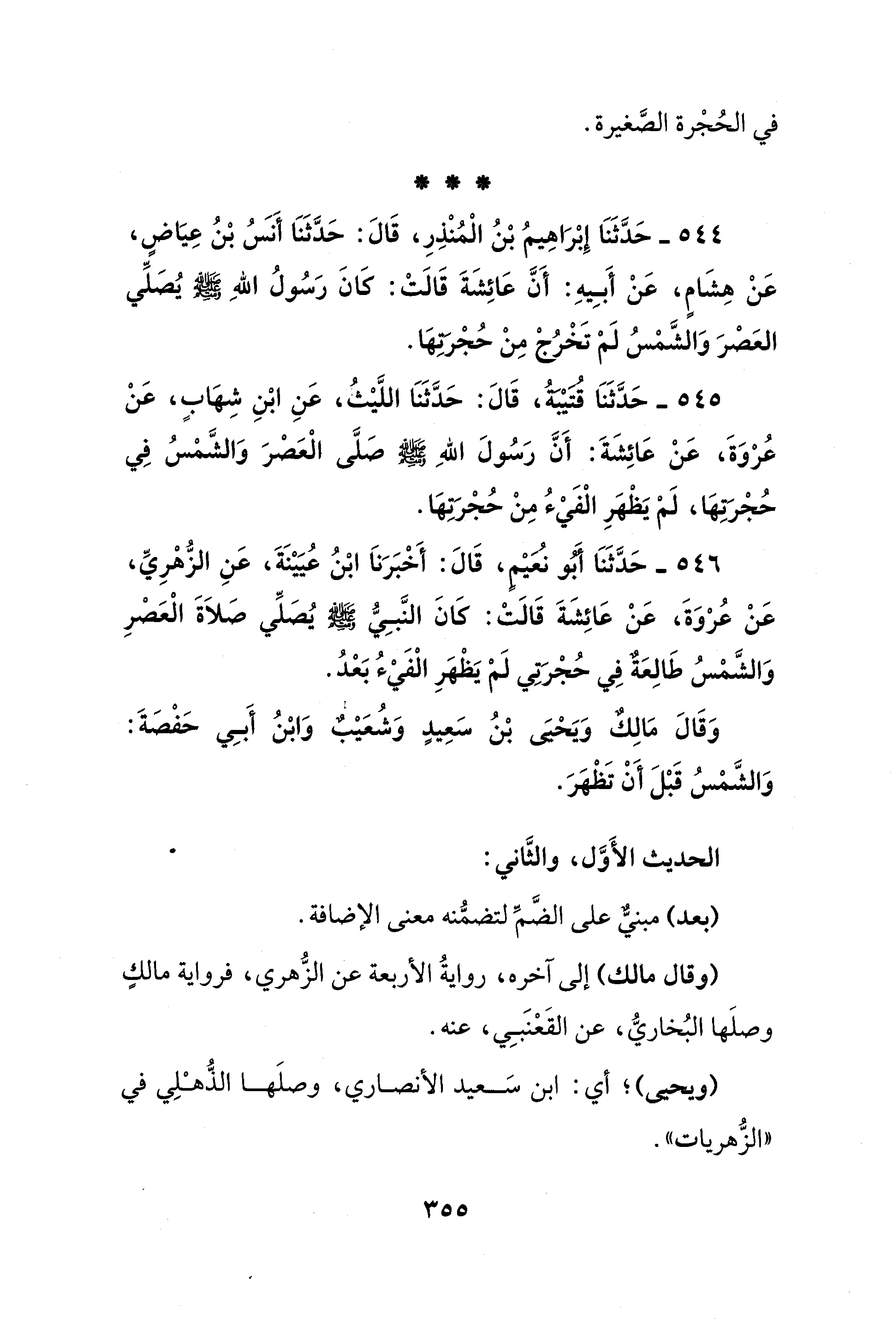 544 - حَدَّثَنَا إِبْرَاهِيمُ بْنُ الْمُنْذِرِ، قَالَ: حَدَّثَنَا أَنَسُ بْنُ عِيَاضٍ، عَنْ هِشَامٍ، عَنْ أَبِيهِ: أَنَّ عَائِشَةَ قَالَتْ: كَانَ رَسُولُ اللهِ - صلى الله عليه وسلم - يُصَلِّي العَصْرَ وَالشَّمْسُ لَمْ تَخْرُجْ مِنْ حُجْرَتِهَا.