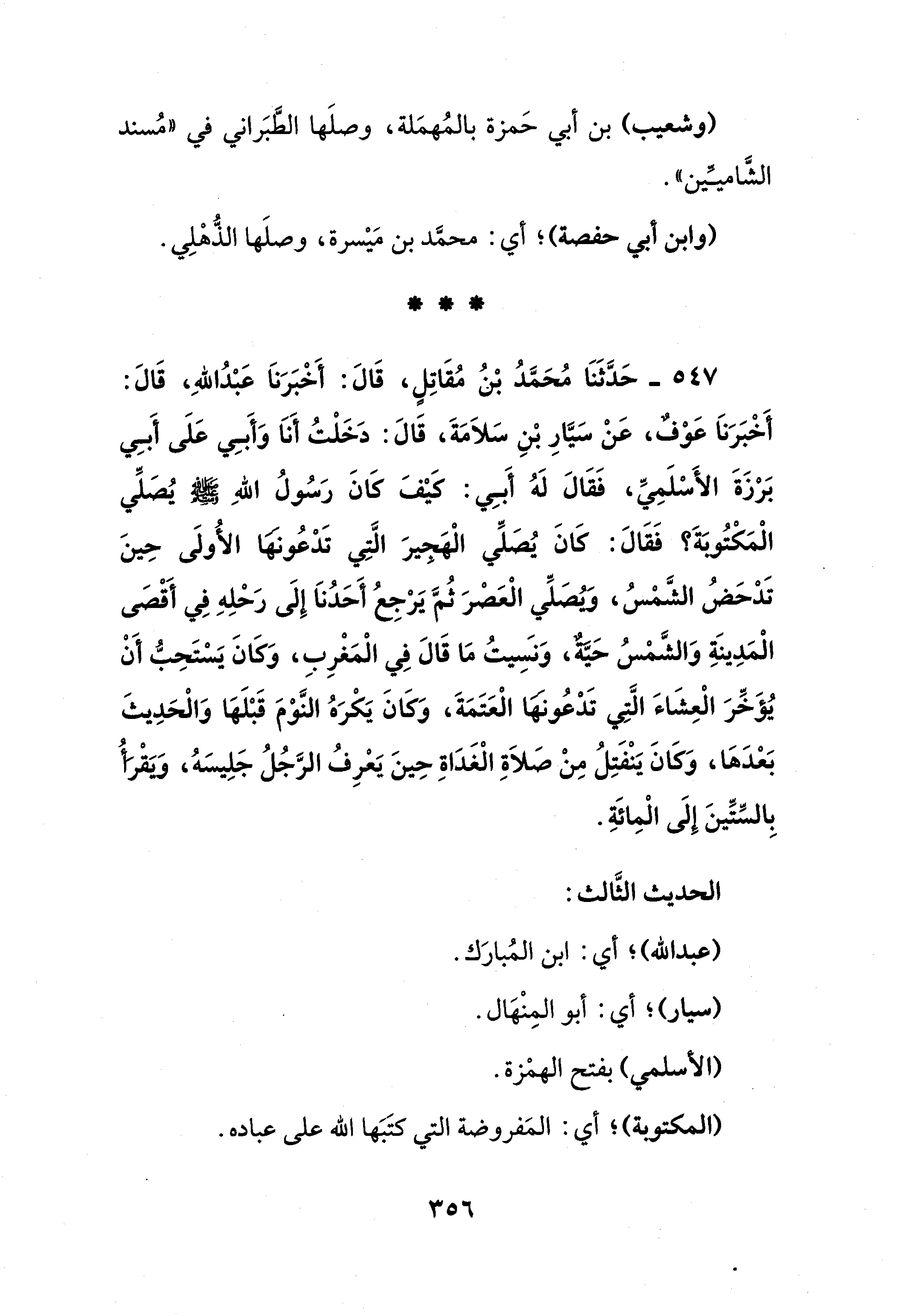 547 - حَدَّثَنَا مُحَمَّدُ بْنُ مُقَاتِلٍ، قَالَ: أَخْبَرَناَ عَبْدُ اللهِ، قَالَ: أَخْبَرَناَ عَوْفٌ، عَنْ سَيَّارِ بْنِ سَلاَمَةَ، قَالَ: دَخَلْتُ أَناَ وَأَبِي عَلَى أَبِي بَرْزَةَ الأَسْلَمِيِّ، فَقَالَ لَهُ أَبِي: كيفَ كَانَ رَسُولُ اللهِ - صلى الله عليه وسلم - يُصَلِّي الْمَكْتُوبَةَ؟ فَقَالَ: كَانَ يُصَلِّي الْهَجِيرَ الَّتِي تَدْعُونها الأُولَى حِينَ تَدْحَضُ الشَّمْسُ، وَيُصَلِّي الْعَصْرَ ثُمَّ يَرْجِعُ أَحَدُناَ إِلَى رَحْلِهِ في أَقْصَى الْمَدِينَةِ وَالشَّمْسُ حَيَّةٌ، وَنَسِيتُ مَا قَالَ في الْمَغْرِبِ، وَكَانَ يَسْتَحِبُّ أَنْ يُؤَخِّرَ الْعِشَاءَ الَّتِي تَدْعُونَهَا الْعَتَمَةَ، وَكَانَ يَكْرَهُ النَّوْمَ قَبْلَهَا وَالْحَدِيثَ بَعْدَهَا، وَكَانَ يَنْفَتِلُ مِنْ صَلاَةِ الْغَدَاةِ حِينَ يَعْرِفُ الرَّجُلُ جَلِيسَهُ، وَيَقْرَأُ بِالسِّتِّينَ إِلَى الْمِائَةِ.