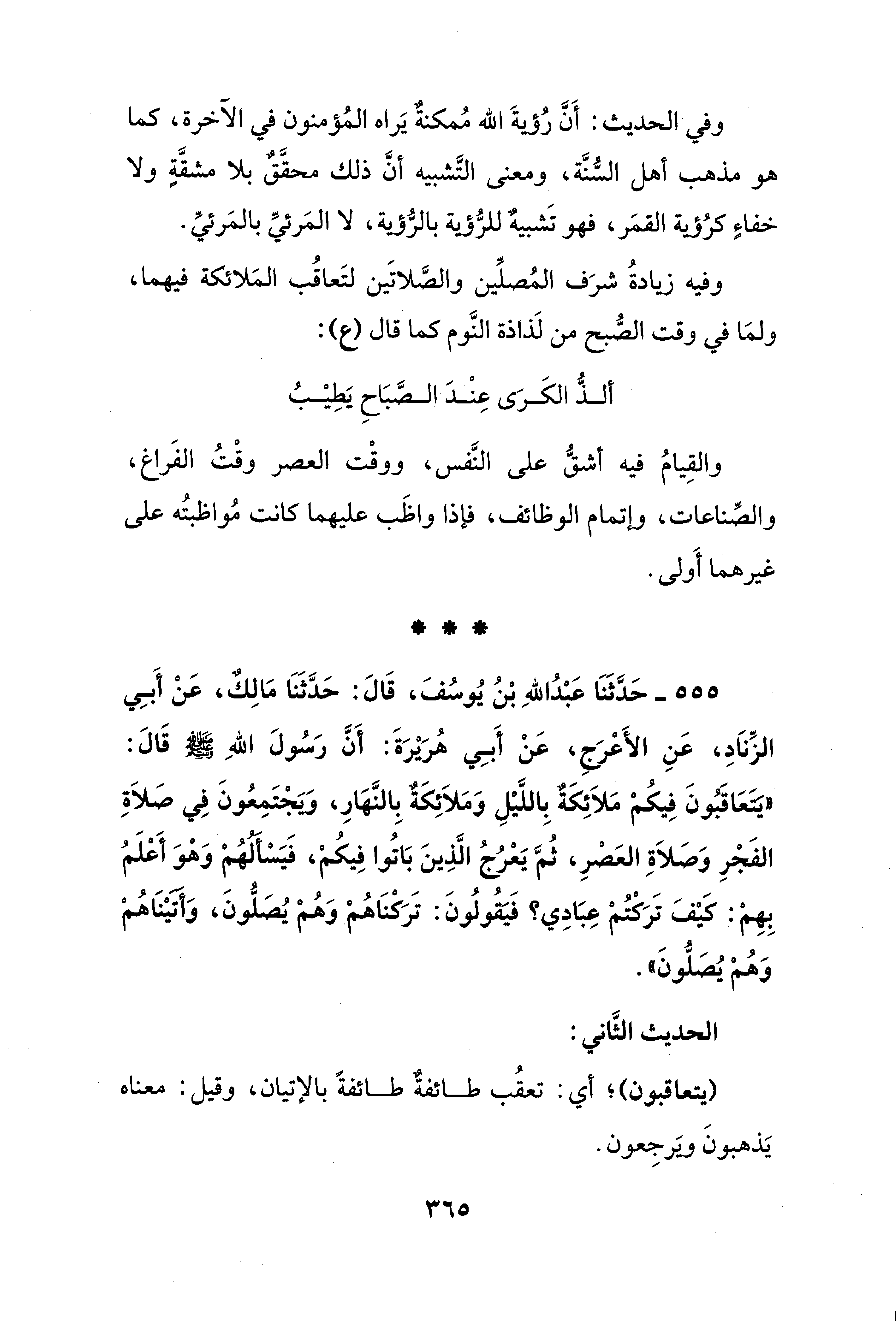 وفي الحديث: أَنَّ رُؤيةَ الله مُمكنةٌ يَراه المُؤمنون في الآخرة، كما هو مذهب أهل السُّنَة، ومعنى التَّشبيه أنَّ ذلك محقَّقٌ بلا مشقَّةٍ ولا خفاءٍ كرُؤية القمَر، فهو تَشبيهٌ للرُّؤية بالرُّؤية، لا المَرئيِّ بالمَرئيِّ.