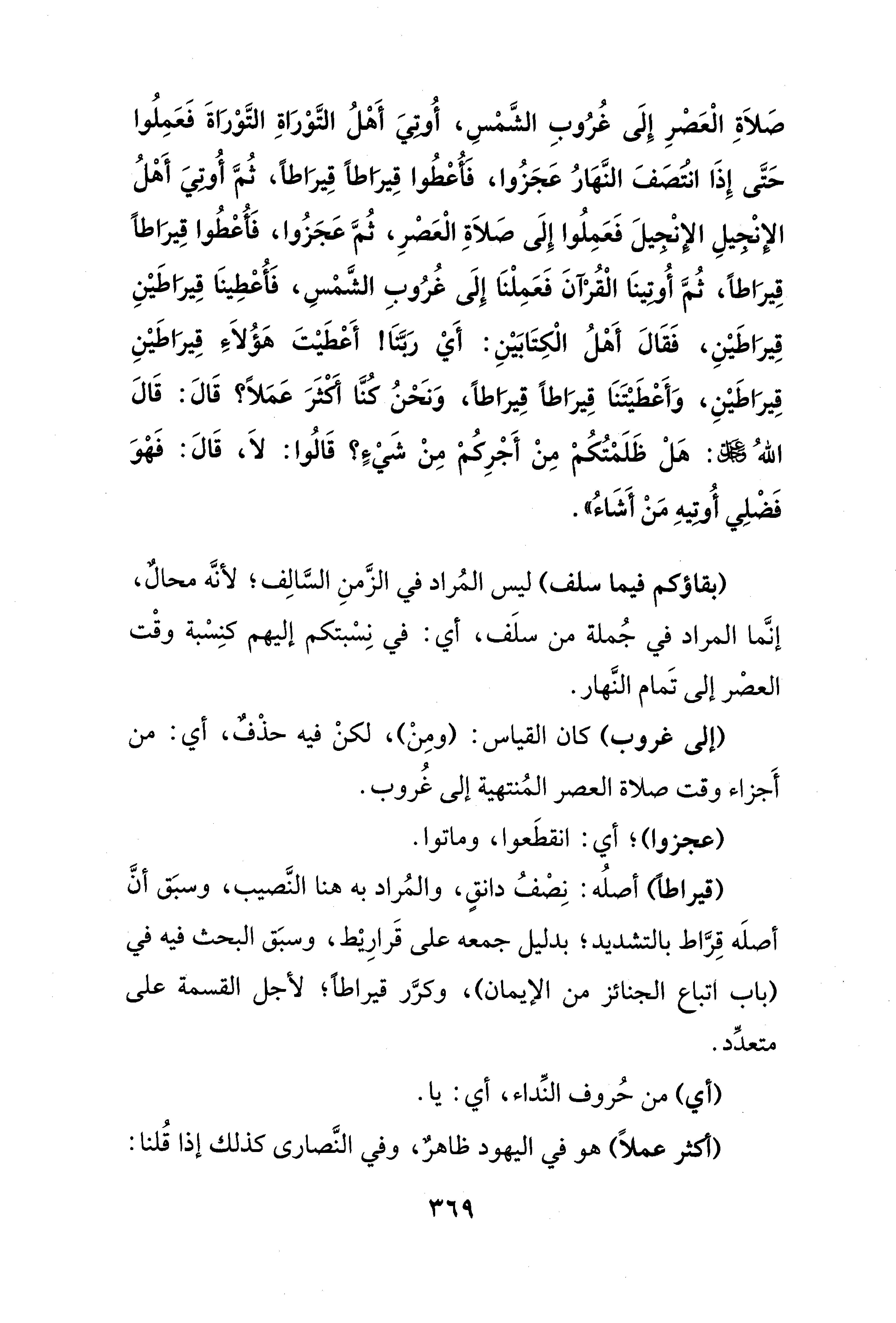 صَلاَةِ الْعَصْرِ إِلَى غُرُوبِ الشَّمْسِ، أُوتِيَ أَهْلُ التَّوْرَاةِ التَّوْرَاةَ فَعَمِلُوا حَتَّى إِذَا انْتَصَفَ النَّهَارُ عَجَزُوا، فَأُعْطُوا قِيرَاطًا قِيرَاطًا، ثُمَّ أُوتِيَ أَهْلُ الإنْجِيلِ الإنْجِيلَ فَعَمِلُوا إِلَى صَلاَةِ الْعَصْرِ، ثُمَّ عَجَزُوا، فَأُعْطُوا قِيرَاطًا قِيرَاطًا، ثُمَّ أُوتِينَا الْقُرْآنَ فَعَمِلْنَا إِلَى غُرُوبِ الشَّمْسِ، فَأُعْطِينَا قِيراطَيْنِ قِيرَاطَيْنِ، فَقَالَ أَهْلُ الْكِتَابَيْنِ: أَيْ رَبَّنَا! أَعْطَيْتَ هَؤُلاَءِ قِيرَاطَيْنِ قِيراطَيْنِ، وَأَعْطَيْتَنَا قِيرَاطًا قِيرَاطًا، وَنَحْنُ كُنَّا أَكْثَرَ عَمَلًا؟ قَالَ: قَالَ اللهُ عَزَّ وَجَلَّ: هَلْ ظَلَمْتُكُمْ مِنْ أَجْرِكُمْ مِنْ شَيْءٍ؟ قَالُوا: لاَ، قَالَ: فَهْوَ فَضْلِي أُوتِيهِ مَنْ أَشَاءُ".