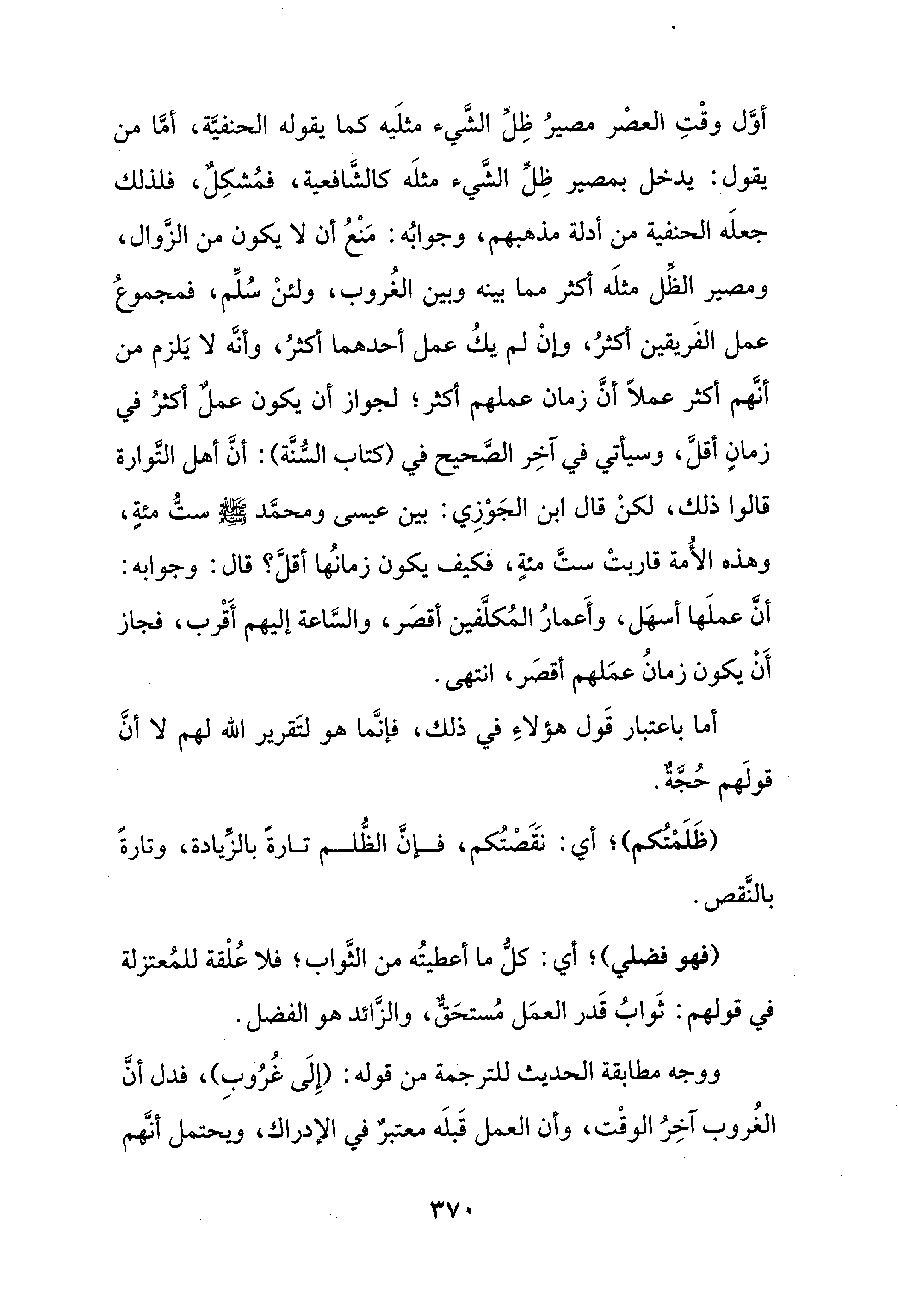 أوَّل وقْتِ العصْر مصيرُ ظِلِّ الشَّيء مثلَيه كما يقوله الحنفيَّة، أمَّا من يقول: يدخل بمصير ظِلِّ الشَّيء مثلَه كالشَّافعية، فمُشكِلٌ، فلذلك جعلَه الحنفية من أدلة مذهبهم، وجوابُه: مَنْعُ أن لا يكون من الزَّوال، ومصير الظِّل مثلَه أكثر مما بينه وبين الغُروب، ولئنْ سُلِّم، فمجموعُ عمل الفَريقين أكثرُ، وإنْ لم يكُ عمل أحدهما أكثرُ، وأنَّه لا يَلزم من أنَّهم أكثر عملًا أنَّ زمان عملهم أكثر؛ لجواز أن يكون عملٌ أكثرُ في زمانٍ أقلَّ، وسيأتي في آخِر الصَّحيح في (كتاب السُّنَّة): أنَّ أهل التَّوارة قالوا ذلك، لكنْ قال ابن الجَوْزِي: بين عيسى ومحمَّد - صلى الله عليه وسلم - ستُّ مئةٍ، وهذه الأُمة قاربتْ ستَّ مئةٍ، فكيف يكون زمانُها أقلَّ؟ قال: وجوابه: أنَّ عملَها أسهَل، وأَعمارُ المُكلَّفين أقصَر، والسَّاعة إليهم أَقْرب، فجاز أَنْ يكون زمانُ عمَلهم أقصَر، انتهى.