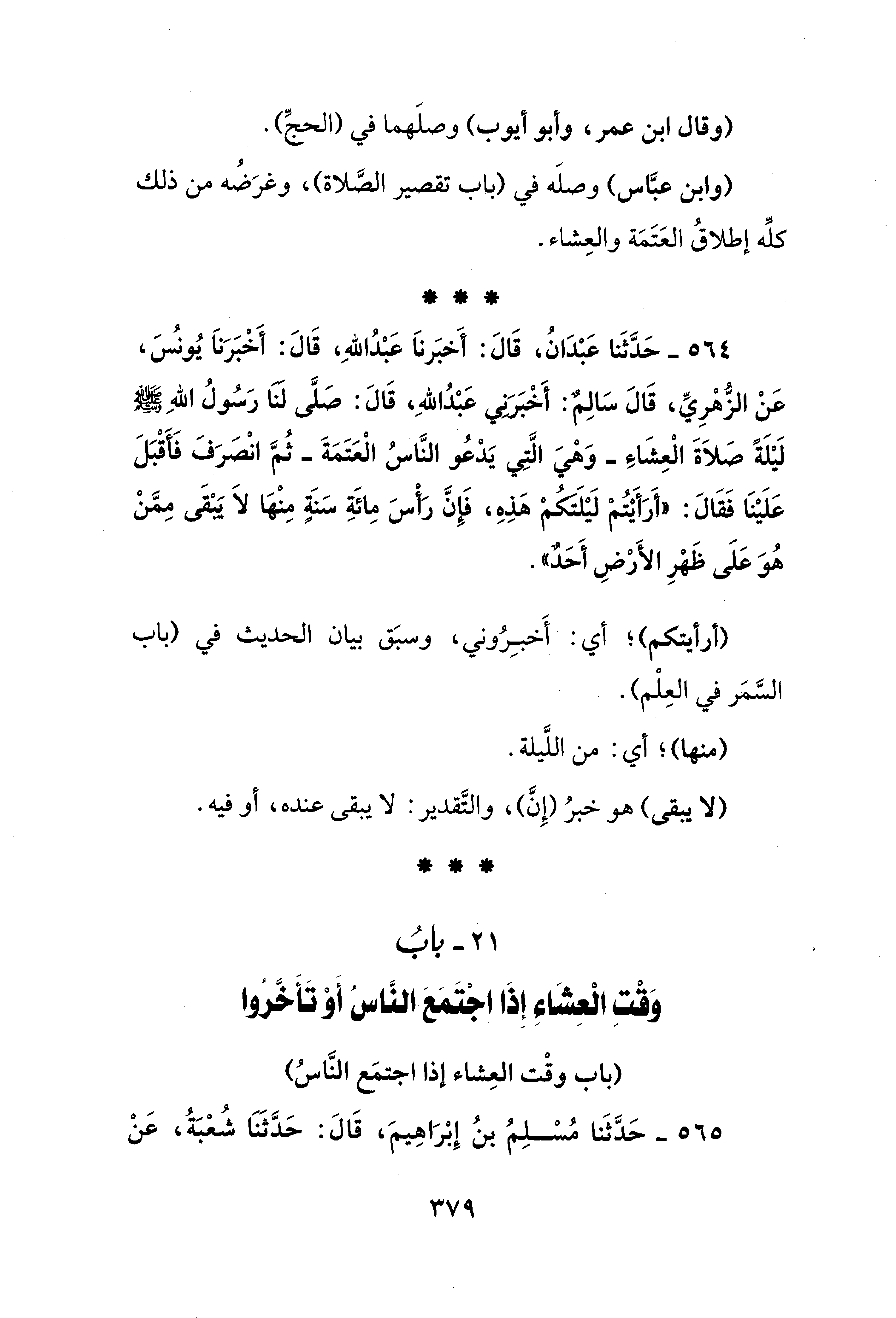 564 - حَدَّثَنا عَبْدَانُ، قَالَ: أَخبَرناَ عَبْدُ اللهِ، قَالَ: أَخْبَرَناَ يُونُسَ، عَنْ الزُّهْرِيِّ، قَالَ سَالِمٌ: أَخْبَرَنِي عَبْدُ اللهِ، قَالَ: صَلَّى لَنَا رَسُولُ اللهِ - صلى الله عليه وسلم - لَيْلَةً صَلاَةَ الْعِشَاءَ -وَهْيَ الَّتِي يَدْعُو النَّاسُ الْعَتَمَةَ- ثُمَّ انْصَرَفَ فَأَقْبَلَ عَلَيْنَا فَقَالَ: "أَرَأَيْتُمْ لَيْلَتكُمْ هَذِهِ، فَإِنَّ رَأْسَ مِائَةِ سَنَةٍ مِنْهَا لاَ يَبْقَى مِمَّنْ هُوَ عَلَى ظَهْرِ الأَرْضِ أَحَدٌ".