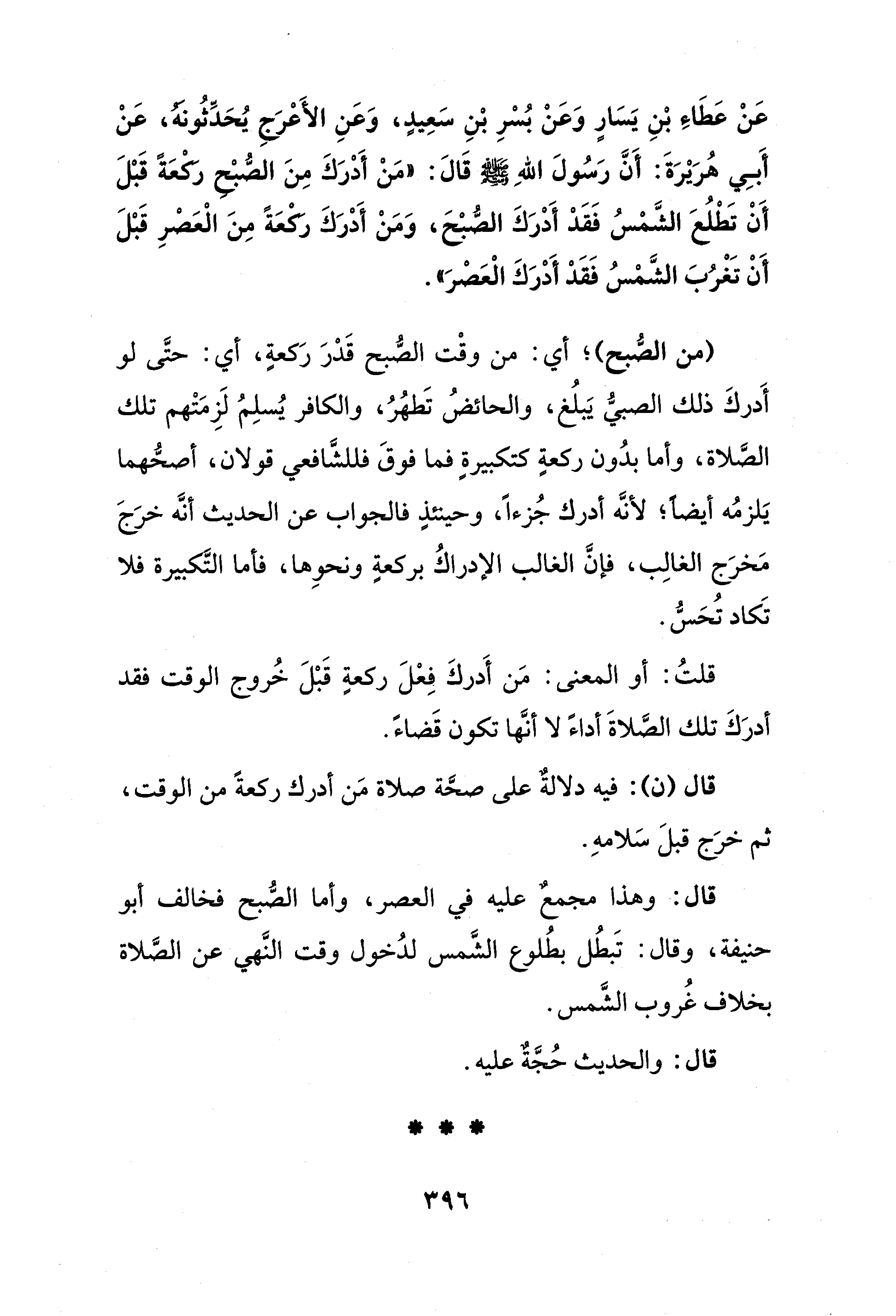 عَنْ عَطَاءِ بْنِ يَسَارٍ وَعَنْ بُسْرِ بْنِ سَعِيدٍ، وَعَنِ الأَعْرَجِ يُحَدِّثُونَهُ، عَنْ أَبِي هُرَيْرَةَ: أَنَّ رَسُولَ اللهِ - صلى الله عليه وسلم - قَالَ: "مَنْ أَدْرَكَ مِنَ الصُّبْحِ رَكْعَةً قَبْلَ أَنْ تَطْلُعَ الشَّمْسُ فَقَدْ أَدْرَكَ الصُّبْحَ، وَمَنْ أَدْرَكَ رَكْعَةً مِنَ الْعَصْرِ قَبْلَ أَنْ تَغْرُبَ الشَّمْسُ فَقَدْ أَدْرَكَ الْعَصْرَ".