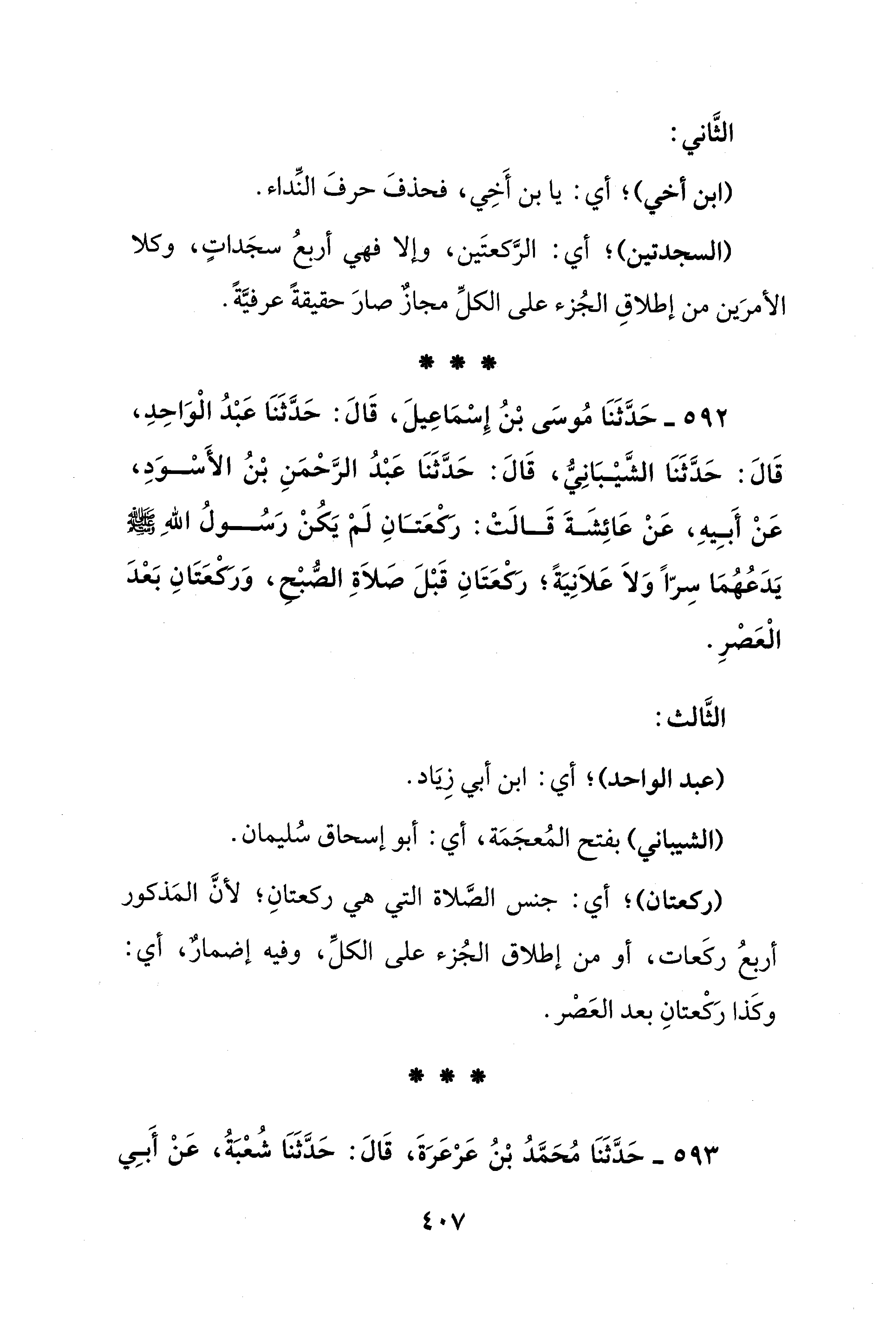 592 - حَدَّثَنَا مُوسَى بْنُ إِسْمَاعِيلَ، قَالَ: حَدَّثَنَا عَبْدُ الْوَاحِدِ، قَالَ: حَدَّثَنَا الشَّيْبَانِيُّ، قَالَ: حَدَّثَنَا عَبْدُ الرَّحْمَنِ بْنُ الأَسْوَدِ، عَنْ أَبِيهِ، عَنْ عَائِشَةَ قَالَتْ: ركْعَتَانِ لَمْ يَكُنْ رَسُولُ اللهِ - صلى الله عليه وسلم - يَدَعُهُمَا سِرًّا وَلاَ عَلاَنِيَةً؛ ركعَتَانِ قَبْلَ صلاَةِ الصُّبْح، وَركعَتَانِ بَعْدَ الْعَصْرِ.