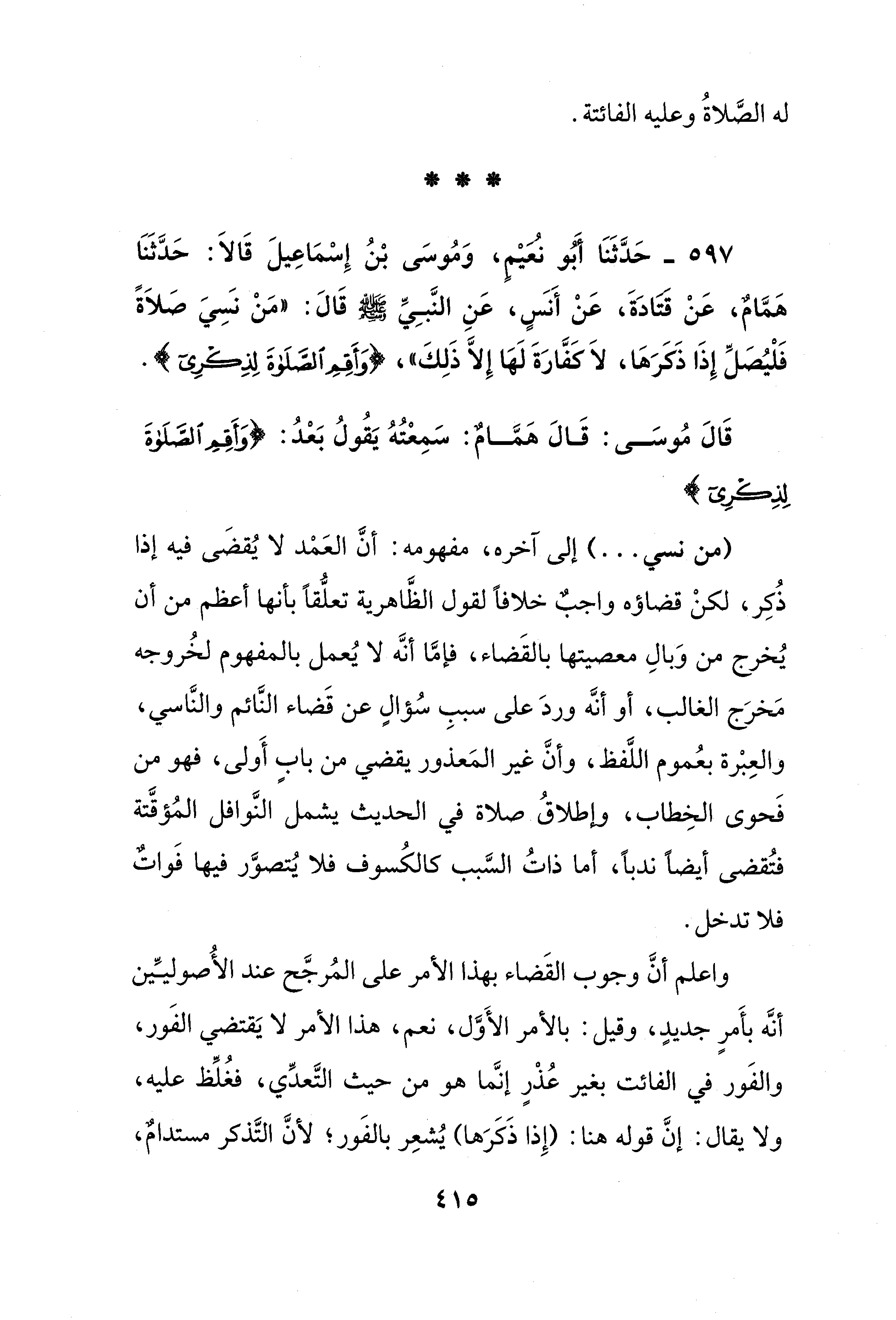 597 - حَدَّثَنَا أبو نعيْمِ، وَمُوسَى بْنُ إِسْمَاعِيلَ قَالاَ: حَدَّثَنَا هَمَّام، عَنْ قتَادَةَ، عَنْ أَنسٍ، عَنِ النَّبِيِّ - صلى الله عليه وسلم - قَالَ: "مَنْ نَسِيَ صلاَةً فَلْيُصَلِّ إِذَا ذَكَرَهَا، لاَ كَفَّارَةَ لَهَا إِلَّا ذَلِكَ"، {وَأَقِمِ الصَّلَاةَ لِذِكْرِي}.