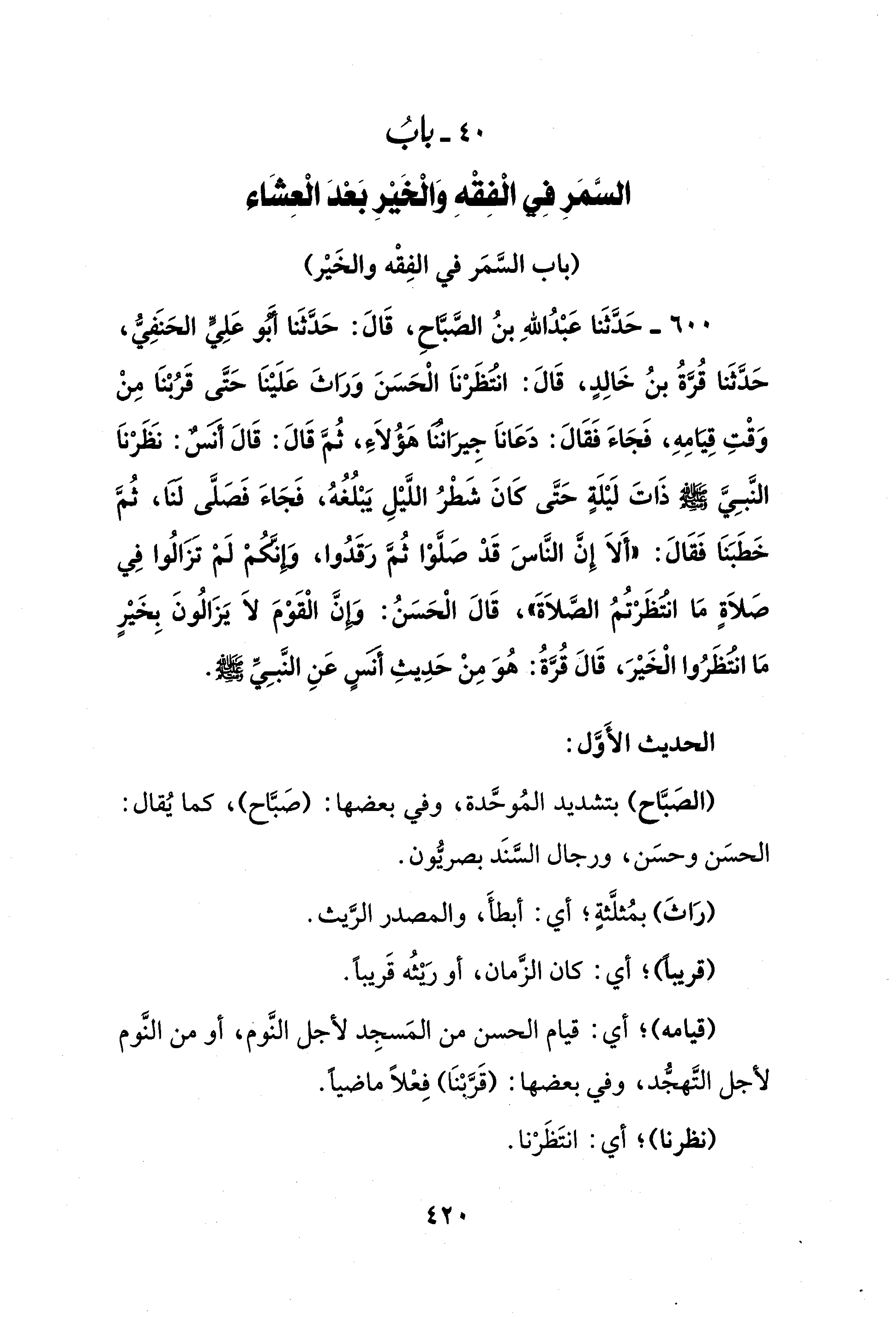 600 - حَدَّثَنا عَبْدُ اللهِ بنُ الصَّبَّاحِ، قَالَ: حَدَّثَنا أبو عَلِي الحَنَفِيُّ، حَدَّثَنا قُرَّةُ بنُ خَالِدٍ، قَالَ: انتُظَرْناَ الْحَسَنَ وَرَاثَ عَلَيْنَا حَتَّى قَرُبْنَا مِنْ وَقْتِ قِيَامِهِ، فَجَاءَ فَقَالَ: دَعَاناَ جِيراننا هَؤُلاَءَ، ثُمَّ قَالَ: قَالَ أنَس: نَظَرْناَ النَّبِيَّ - صلى الله عليه وسلم - ذَاتَ لَيلَةٍ حَتَّى كَانَ شَطْرُ اللَّيلِ يَبْلُغُهُ، فَجَاءَ فَصَلَّى لنا، ثُمَّ خَطَبَنَا فَقَالَ: "ألاَ إِنَّ النَّاسَ قَدْ صَلَّوْا ثُمَّ رَقَدُوا، وَإِنَّكمْ لَمْ تَزَالُوا فِي صلاَةٍ مَا انتُظَرْتُمُ الصَّلاَةَ"، قَالَ الْحَسَنُ: وَإِنَّ الْقَوْمَ لاَ يَزَالُونَ بِخَيْرٍ مَا انتُظَرُوا الْخَيْرَ، قَالَ قُرَّةُ: هُوَ مِنْ حَدِيثِ أنَس عَنِ النَّبِيِّ - صلى الله عليه وسلم -.