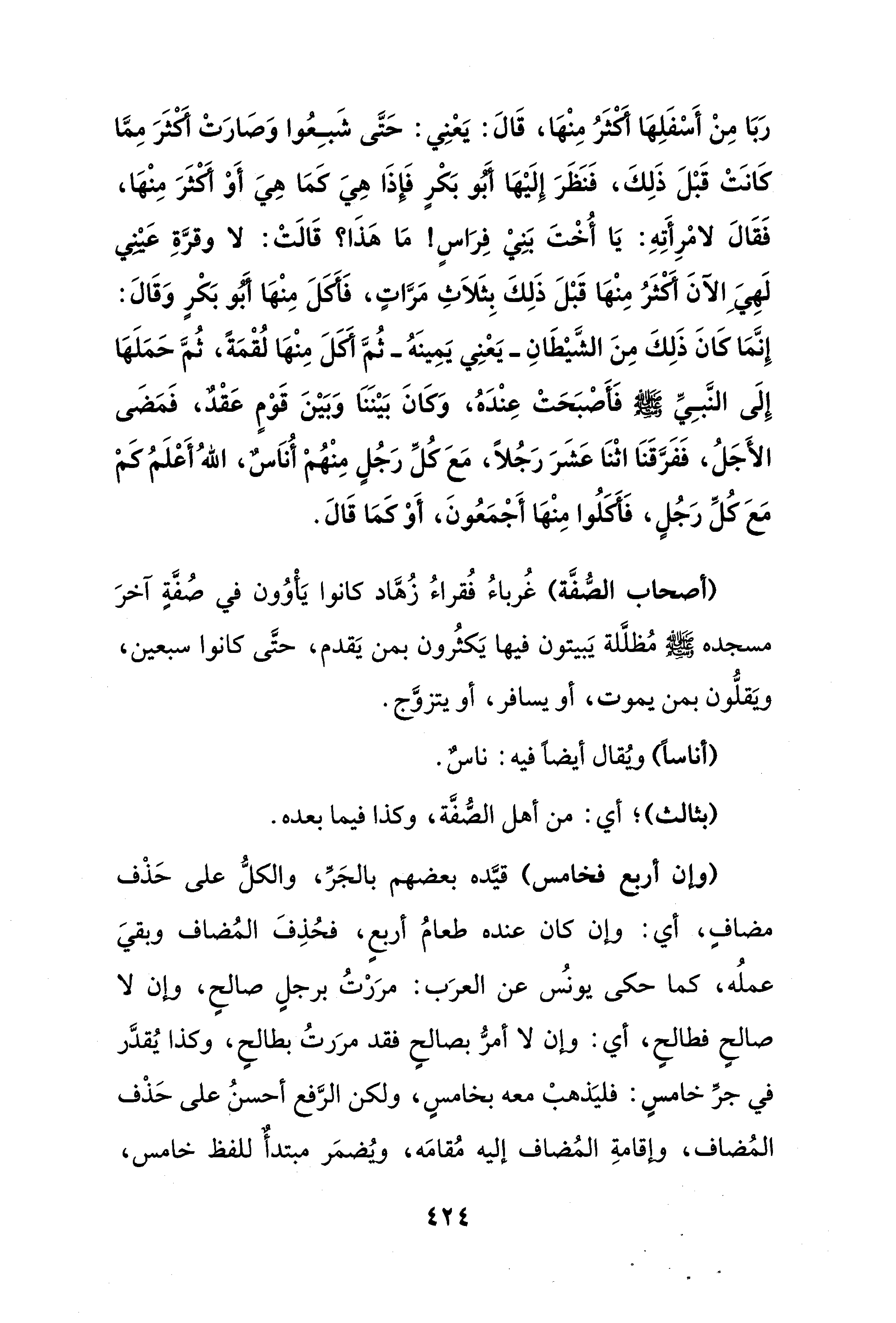 رَبَا مِنْ أَسْفَلِهَا أكثَرُ مِنْهَا، قَالَ: يَعْنِي: حَتَّى شَبِعُوا وَصَارَتْ أكثَرَ مِمَّا كَانَتْ قَبْلَ ذَلِكَ، فَنَظَرَ إِلَيْهَا أبو بَكْرٍ فَإِذَا هِيَ كَمَا هِيَ أَوْ أكثَرَ مِنْهَا، فَقَالَ لامْرِأَتِهِ: يَا أُخْتَ بَنِي فِراسٍ! مَا هَذَا؟ قَالَتْ: لا وقرَّةِ عَيْني لَهِيَ الآنَ أكثَرُ مِنْهَا قَبْلَ ذَلِكَ بِثَلاَثِ مَرَّاتٍ، فَأكلَ مِنْهَا أبو بَكْرٍ وَقَالَ: إِنَّمَا كَانَ ذَلِكَ مِنَ الشَّيْطَانِ -يَعْنِي يَمِينَهُ- ثُمَّ أَكَلَ مِنْهَا لُقْمَةً، ثُمَّ حَمَلَهَا إِلَى النَّبِيِّ - صلى الله عليه وسلم - فَأصْبَحَتْ عِنْدَهُ، وَكَانَ بَيْنَنَا وَبَيْنَ قَوْمٍ عَقْدٌ، فَمَضَى الأَجَلُ، فَفَرَّقَنَا اثْنَا عَشَرَ رَجُلًا، مَعَ كُلِّ رَجُلٍ مِنْهُنم أُناَسٌ، اللهُ أَعْلَمُ كم مَعَ كُلِّ رَجُلٍ، فَأكلُوا مِنْهَا أَجْمَعُونَ، أَوْ كَمَا قَالَ.