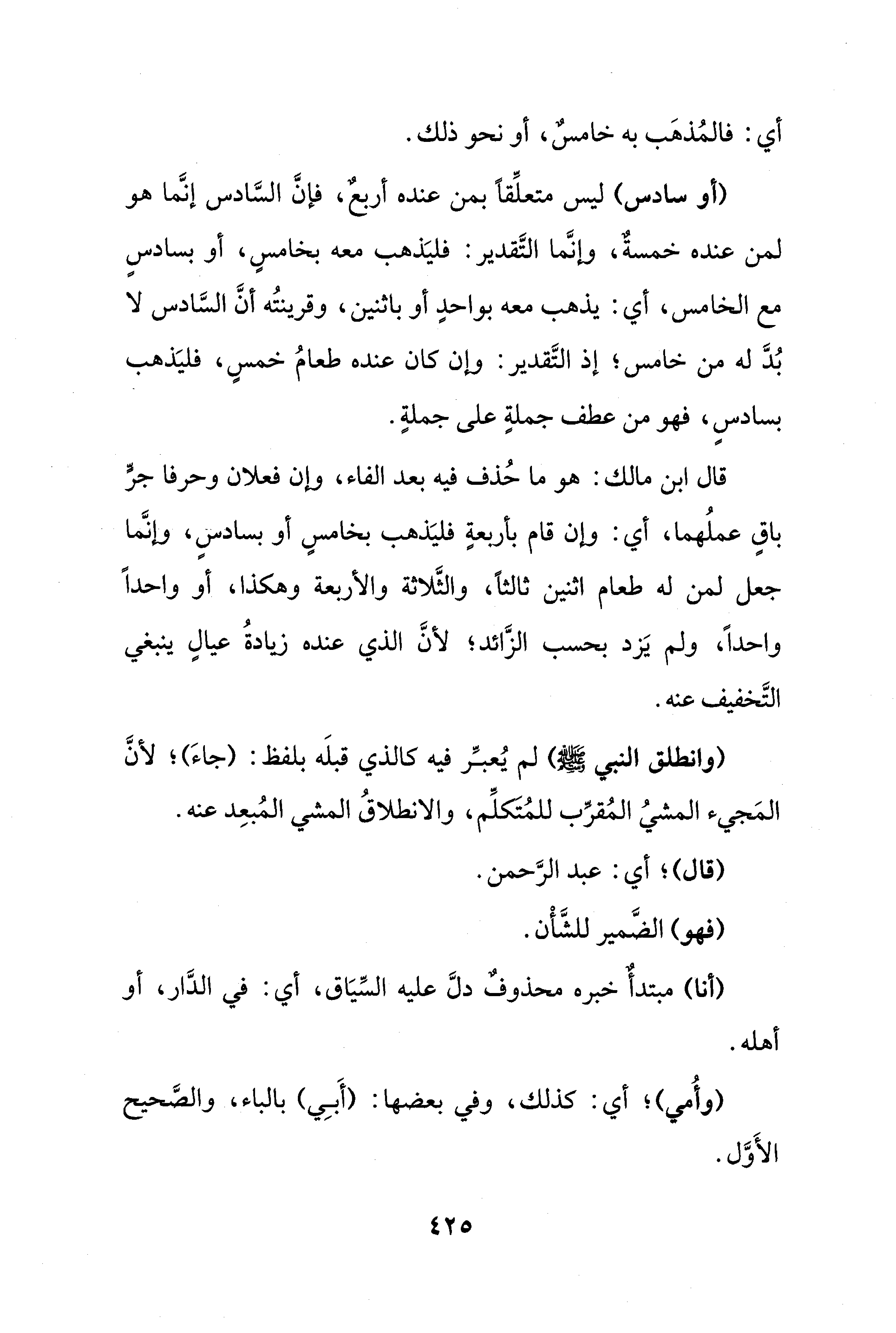 (أو سادس) ليس متعلِّقًا بمن عنده أربعٌ، فإنَّ السَّادس إنَّما هو لمن عنده خمسةٌ، وإنَّما التَّقدير: فليَذهب معه بخامسٍ، أو بسادسٍ مع الخامس، أي: يذهب معه بواحدٍ أو باثنين، وقرينتُه أنَّ السَّادس لا بُدَّ له من خامس؛ إذ التَّقدير: وإن كان عنده طعامُ خمسٍ، فليَذهب بسادسٍ، فهو من عطف جملةٍ على جملةٍ.