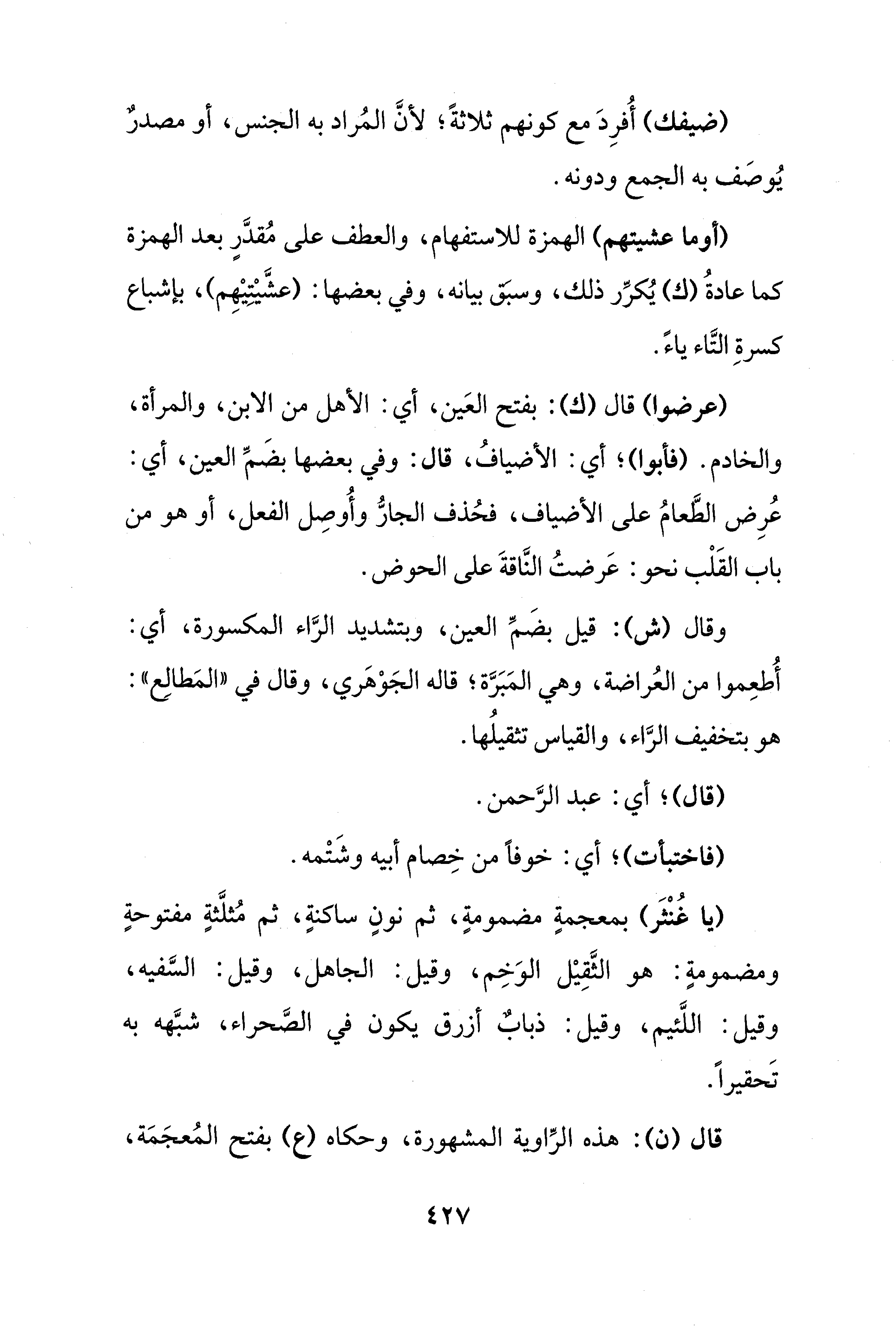 وقال (ش): قيل بضمِّ العين، وبتشديد الرَّاء المكسورة، أي: أُطعِموا من العُراضة، وهي المَبَرَّة؛ قاله الجَوْهَري، وقال في "المَطالِع": هو بتخفيف الرَّاء، والقياس تثقيلُها.
