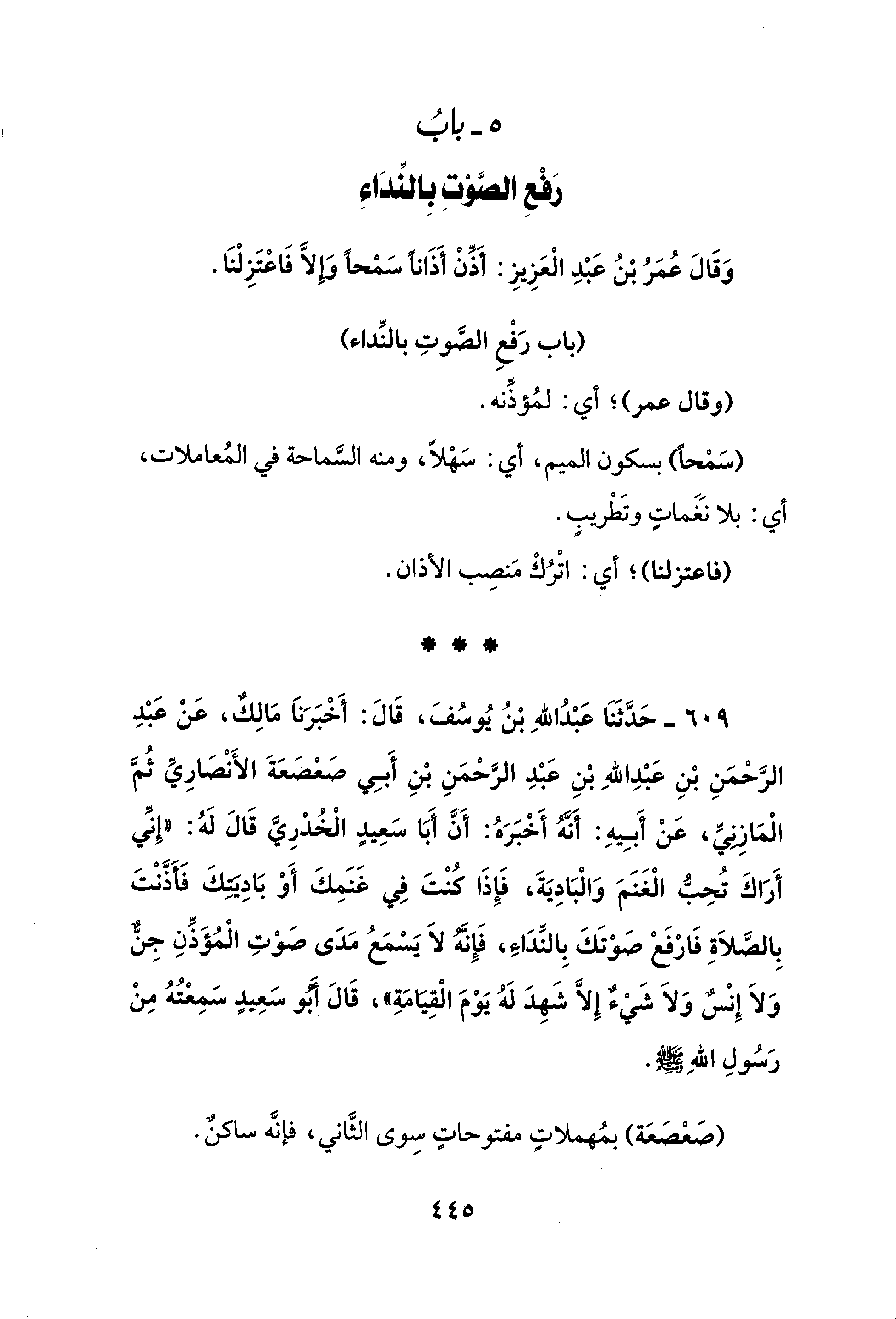 609 - حَدَّثَنَا عَبْدُ اللهِ بْنُ يُوسُفَ، قَالَ: أَخْبَرَناَ مَالِكٌ، عَنْ عَبْدِ الرَّحْمَنِ بْنِ عَبْدِ اللهِ بْنِ عَبْدِ الرَّحْمَنِ بْنِ أَبِي صَعْصَعَةَ الأَنْصَارِيِّ ثُمَّ الْمَازنيِّ، عَنْ أَبِيهِ: أنَّهُ أَخْبَرَهُ: أَنَّ أَبَا سَعِيدٍ الْخُدْرِيَّ قَالَ لَهُ: "إِنِّي أَرَاكَ تُحِبُّ الْغَنَمَ وَالْبَادِيَةَ، فَإذَا كُنْتَ فِي غَنَمِكَ أَوْ بَادِيَتِكَ فَأذَّنْتَ بِالصَّلاَةِ فَارْفَعْ صَوْتَكَ بِالنِّدَاءَ، فَإنَّهُ لاَ يَسْمَعُ مَدَى صَوْتِ الْمُؤَذِّنِ جِنٌّ وَلاَ إِنْسٌ وَلاَ شَيْءٌ إِلَّا شَهِدَ لَهُ يَوْمَ الْقِيَامَةِ"، قَالَ أَبُو سَعِيدٍ سَمِعْتُهُ مِنْ رَسولِ اللهِ - صلى الله عليه وسلم -.
