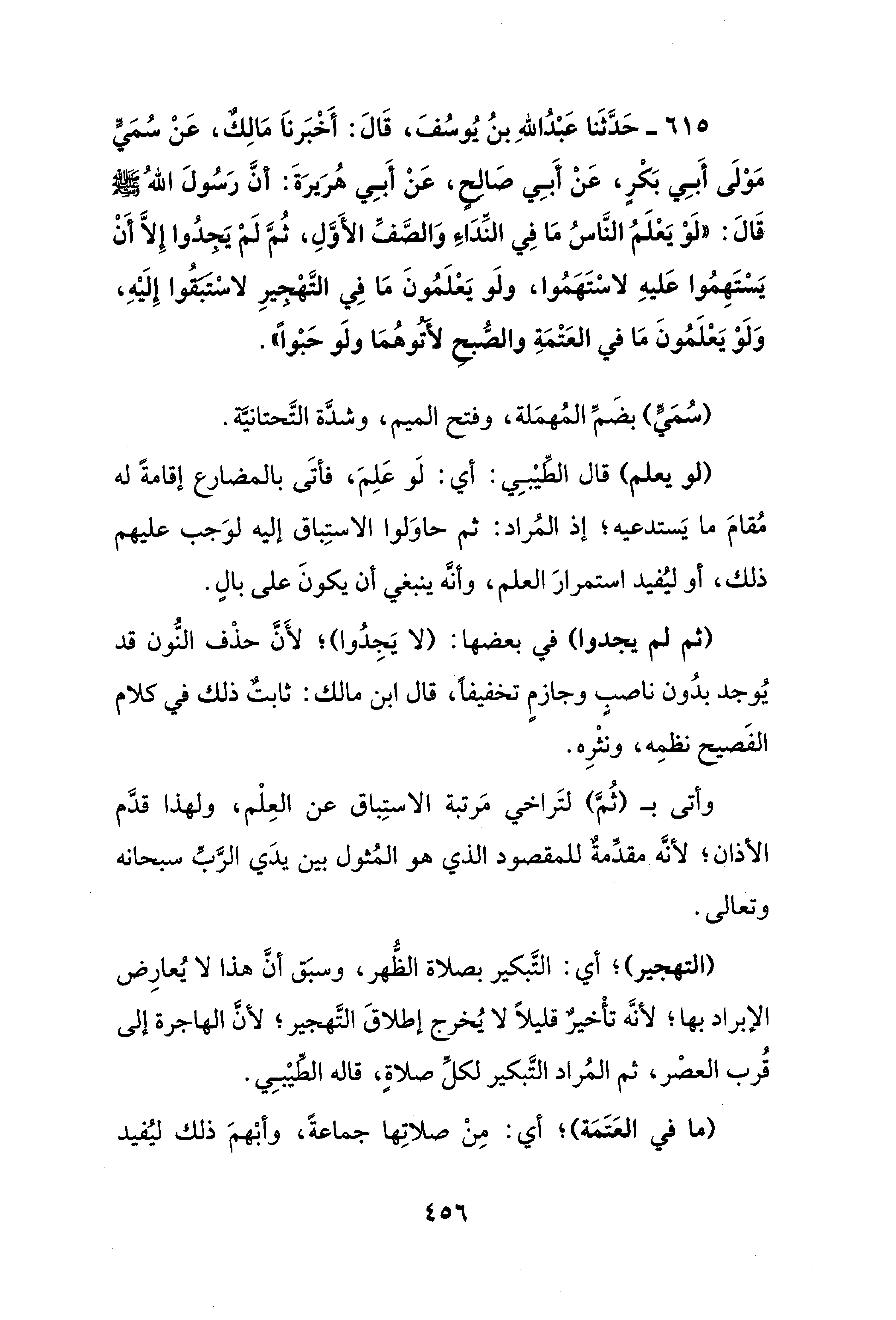 615 - حَدَّثَنا عَبْدُ اللهِ بنُ يُوسُفَ، قَالَ: أَخْبَرناَ مَالِك، عَنْ سُمَيٍّ مَوْلَى أَبِي بَكْرٍ، عَنْ أَبِي صالحٍ، عَنْ أَبِي هُرَيرَةَ: أنَّ رَسُولَ اللهُ - صلى الله عليه وسلم - قَالَ: "لَوْ يَعْلَمُ النَّاسُ مَا فِي النِّدَاء وَالصَّفِّ الأَوَّلِ، ثُمَّ لَمْ يَجدُوا إِلَّا أَنْ يَسْتَهِمُوا عَليهِ لاسْتَهَمُوا، ولَو يَعْلَمُونَ مَا فِي التَّهْجيرِ لاسْتبَقُوا إلَيْهِ، وَلَوْ يَعْلَمُونَ مَا في العَتْمَةِ والصُّبح لأتوهُمَا ولَو حَبْوًا".
