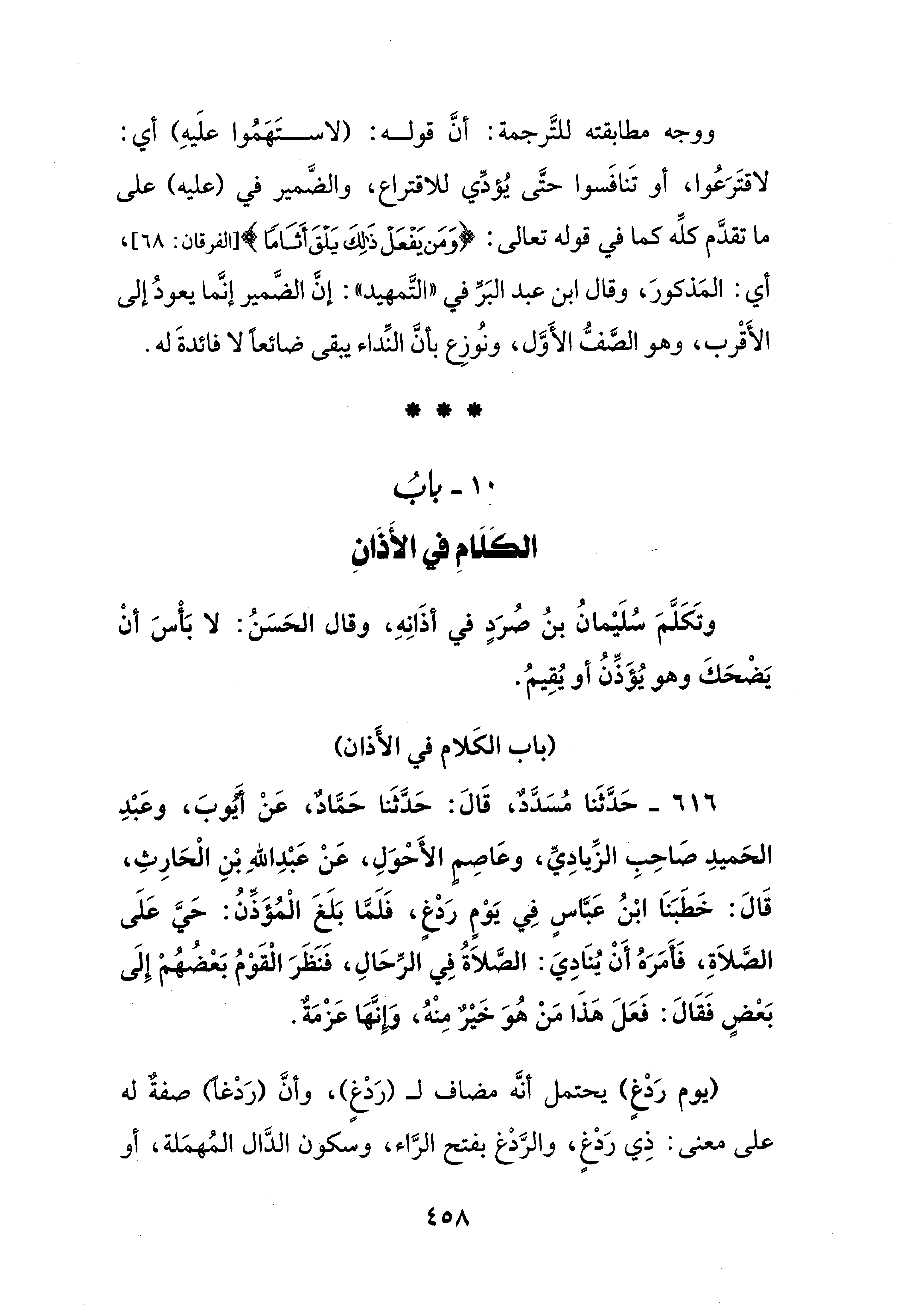 وتَكَلَّمَ سُلَيْمانُ بنُ صُرَدٍ في أذَانِهِ، وقال الحَسَنُ: لا بَأْسَ أنْ يَضْحَكَ وهو يُؤَذِّنُ أو يُقِيمُ.