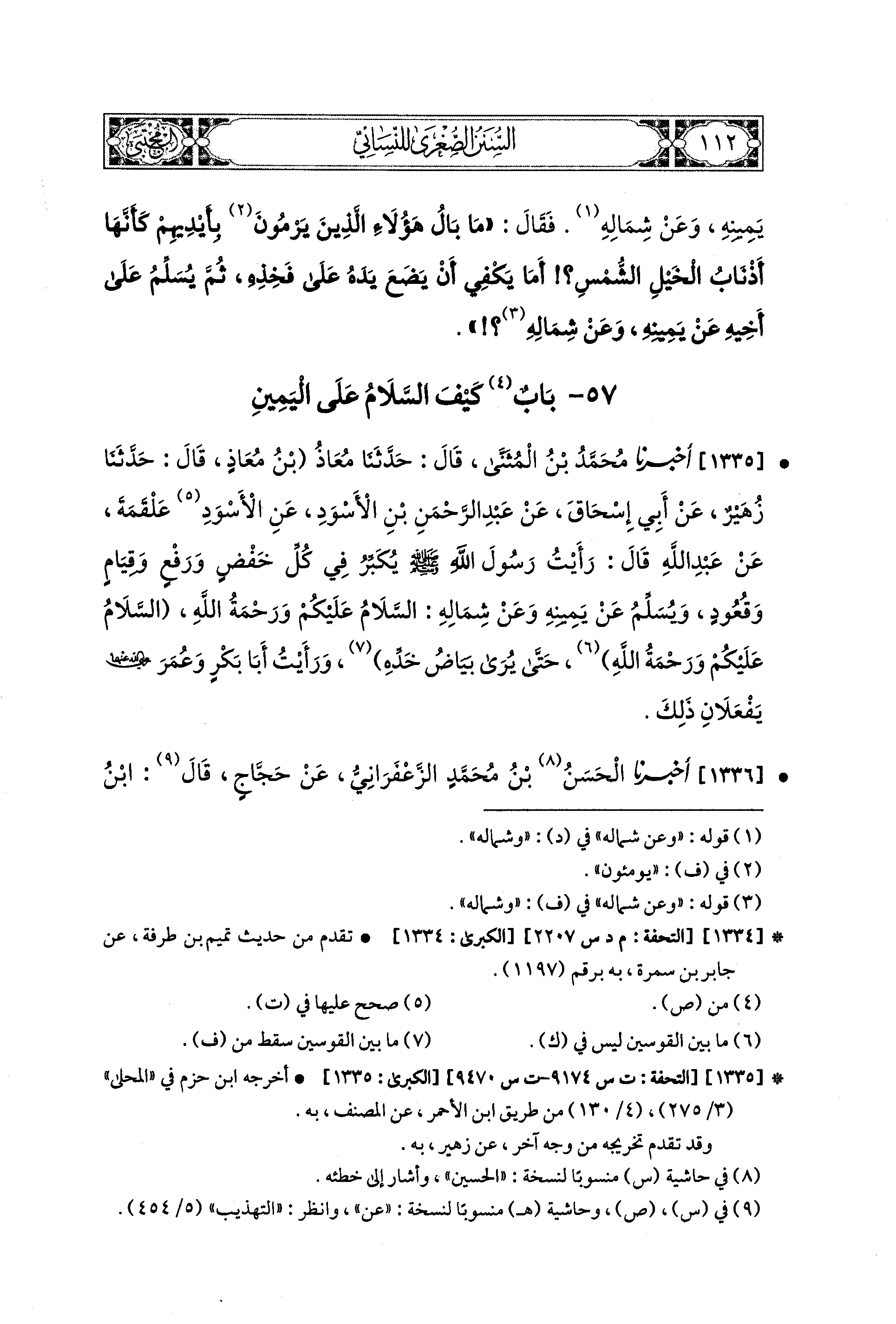 1296- أَخبَرَنا مُحَمد بنُ بَشَّارٍ، قال: حَدثنا يَحيَى بنُ سَعيدٍ، عَن هِشَامٍ، عَن قَتَادَةَ (ح) وَأَخبَرنا مُحَمدُ بنُ المُثَنَّى، قال: حَدثنا يَحيَى، قال: حَدثنا هِشَامٌ، قال: حَدثنا قَتَادَةُ، عَن يُونُسَ بْنِ جُبَيْرٍ، عَن حِطَّانَ بْنِ عَبدِ اللهِ، عَن أبي موسى الأَشْعَرِيَّ قَالَ: إِنَّ رَسُولَ اللهِ صَلى الله عَليه وسَلم خَطَبَنَا فَعَلَّمَنَا سُنَّتَنَا وَبَيَّنَ لَنَا صَلاَتَنَا، فَقَالَ: إِذَا قُمْتُمْ إِلَى الصَّلاَةِ فَأَقِيمُوا صُفُوفَكُمْ، ثُمَّ لِيَؤُمَّكُمْ أَحَدُكُمْ، فَإِذَا كَبَّرَ فَكَبِّرُوا، وَإِذَا قَالَ: {وَلاَ الضَّالِّينَ}، فَقُولُوا: آمينَ، يُجِبْكُمُ اللهُ، ثُمَّ إِذَا كَبَّرَ وَرَكَعَ، فَكَبِّرُوا وَارْكَعُوا، فَإِنَّ الإِمَامَ يَرْكَعُ قَبْلَكُمْ وَيَرْفَعُ قَبْلَكُمْ، قَالَ نَبِيُّ اللهِ صَلى الله عَليه وسَلم: فَتِلْكَ بِتِلْكَ، وَإِذَا قَالَ: سَمِعَ اللهُ لِمَنْ حَمِدَهُ، فَقُولُوا: اللهُمَّ رَبَّنَا لَكَ الحَمْدُ، فَإِنَّ اللهَ عَزَّ وَجَلَّ قَالَ عَلَى لِسَانِ نَبِيِّهِ صَلى الله عَليه وسَلم: سَمِعَ اللهُ لِمَنْ حَمِدَهُ، ثُمَّ إِذَا كَبَّرَ وَسَجَدَ، فَكَبِّرُوا وَاسْجُدُوا، فَإِنَّ الإِمَامَ يَسْجُدُ قَبْلَكُمْ وَيَرْفَعُ قَبْلَكُمْ، قَالَ نَبِيُّ اللهِ صَلى الله عَليه وسَلم: فَتِلْكَ بِتِلْكَ، فَإِذَا كَانَ عِنْدَ القَعْدَةِ فَلْيَكُنْ مِنْ قَوْلِ أَحَدِكُمْ أَنْ يَقُولَ: التَّحِيَّاتُ الطَّيِّبَاتُ الصَّلَوَاتُ لِلَّهِ، السَّلاَمُ عَلَيْكَ أَيُّهَا النَّبيُّ وَرَحْمَةُ اللهِ وَبَرَكَاتُهُ، السَّلاَمُ عَلَيْنَا وَعَلَى عِبَادِ اللهِ الصَّالِحِينَ، أَشْهَدُ أَنْ لاَ إِلَهَ إِلاَّ اللهُ، وأَنَّ مُحَمدًا عَبدُهُ وَرَسُولُهُ.