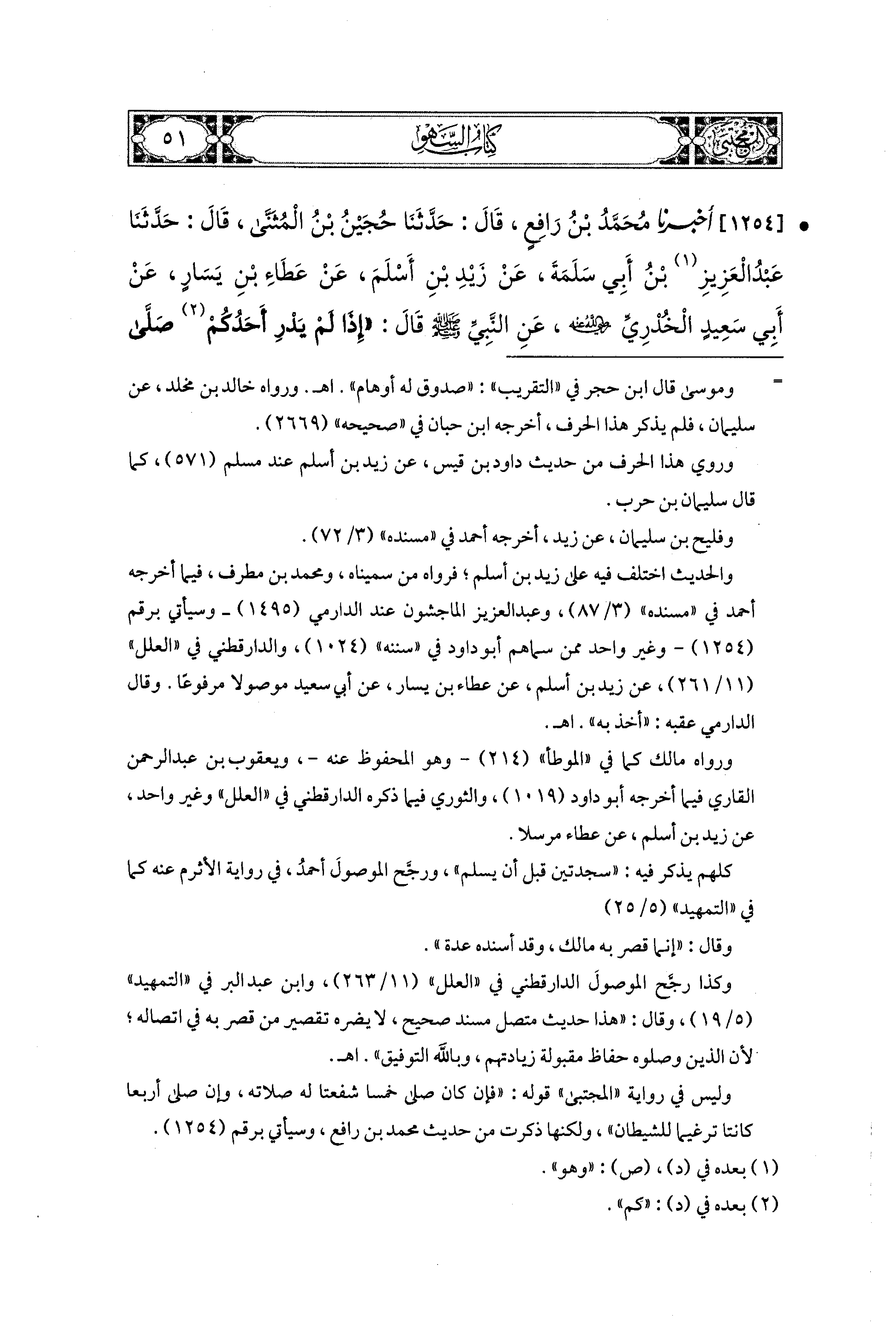 1235- أَخبَرَنا قُتَيبَةُ، عَن مَالِكٍ، عَنِ ابنِ شِهَابٍ، عَن الأَعْرَجِ، عَن عَبدِ اللهِ بْنِ بُحَيْنَةَ، قَالَ: صَلَّى لَنَا رَسُولُ اللهِ صَلى الله عَليه وسَلم رَكْعَتَيْنِ، ثُمَّ قَامَ فَلَمْ يَجْلِسْ، فَقَامَ النَّاسُ مَعَهُ، فَلَمَّا قَضَى صَلاَتَهُ وَنَظَرْنَا تَسْلِيمَهُ، كَبَّرَ فَسَجَدَ سَجْدَتَيْنِ وَهُوَ جَالِسٌ قَبْلَ التَّسْلِيمِ ثُمَّ سَلَّمَ.