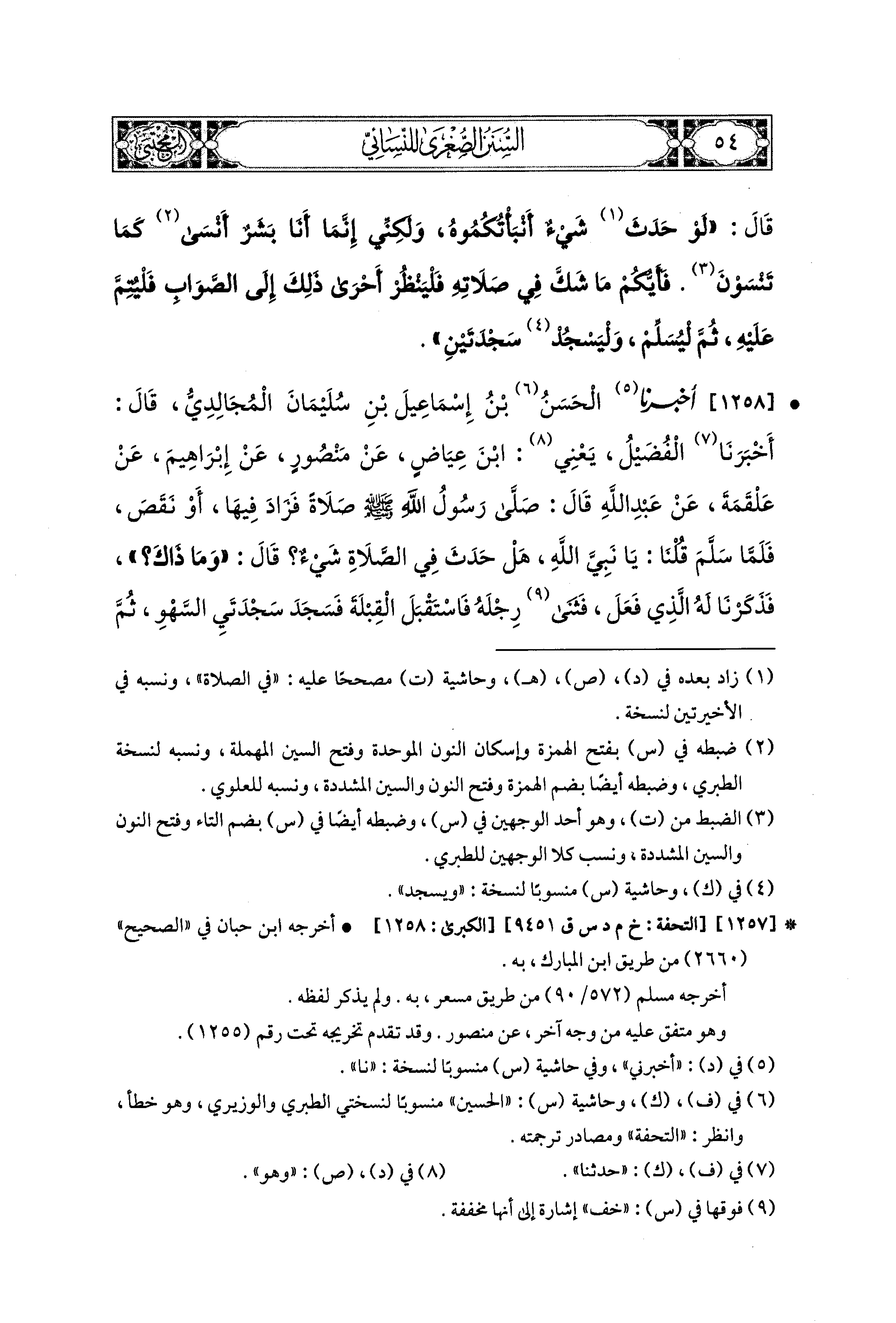 1238- أَخبَرَنا مُحَمد بنُ سَلَمَةَ، قال: حَدثنا ابْنُ القَاسِمِ، عَن مَالِكٍ، قَالَ: حَدَّثَني أَيُّوبُ، عَن مُحَمدِ بْنِ سِيرِينَ، عَن أَبي هُرَيرَةَ، أَنَّ رَسُولَ اللهِ صَلى الله عَليه وسَلم انْصَرَفَ مِنَ اثْنَتَيْنِ، فَقَالَ لَهُ ذُو اليَدَيْنِ: أَقُصِرَتِ الصَّلاَةُ أَمْ نَسِيتَ يَا رَسُولَ اللهِ؟ فَقَالَ رَسُولُ اللهِ صَلى الله عَليه وسَلم: أَصَدَقَ ذُو اليَدَيْنِ؟ فَقَالَ النَّاسُ: نَعَمْ، فَقَامَ رَسُولُ اللهِ صَلى الله عَليه وسَلم فَصَلَّى اثْنَتَيْنِ، ثُمَّ سَلَّمَ، ثُمَّ كَبَّرَ فَسَجَدَ مِثْلَ سُجُودِهِ، أَوْ أَطْوَلَ، ثُمَّ رَفَعَ رَأْسَهُ ثُمَّ سَجَدَ مِثْلَ سُجُودِهِ، أَوْ أَطْوَلَ ثُمَّ رَفَعَ.