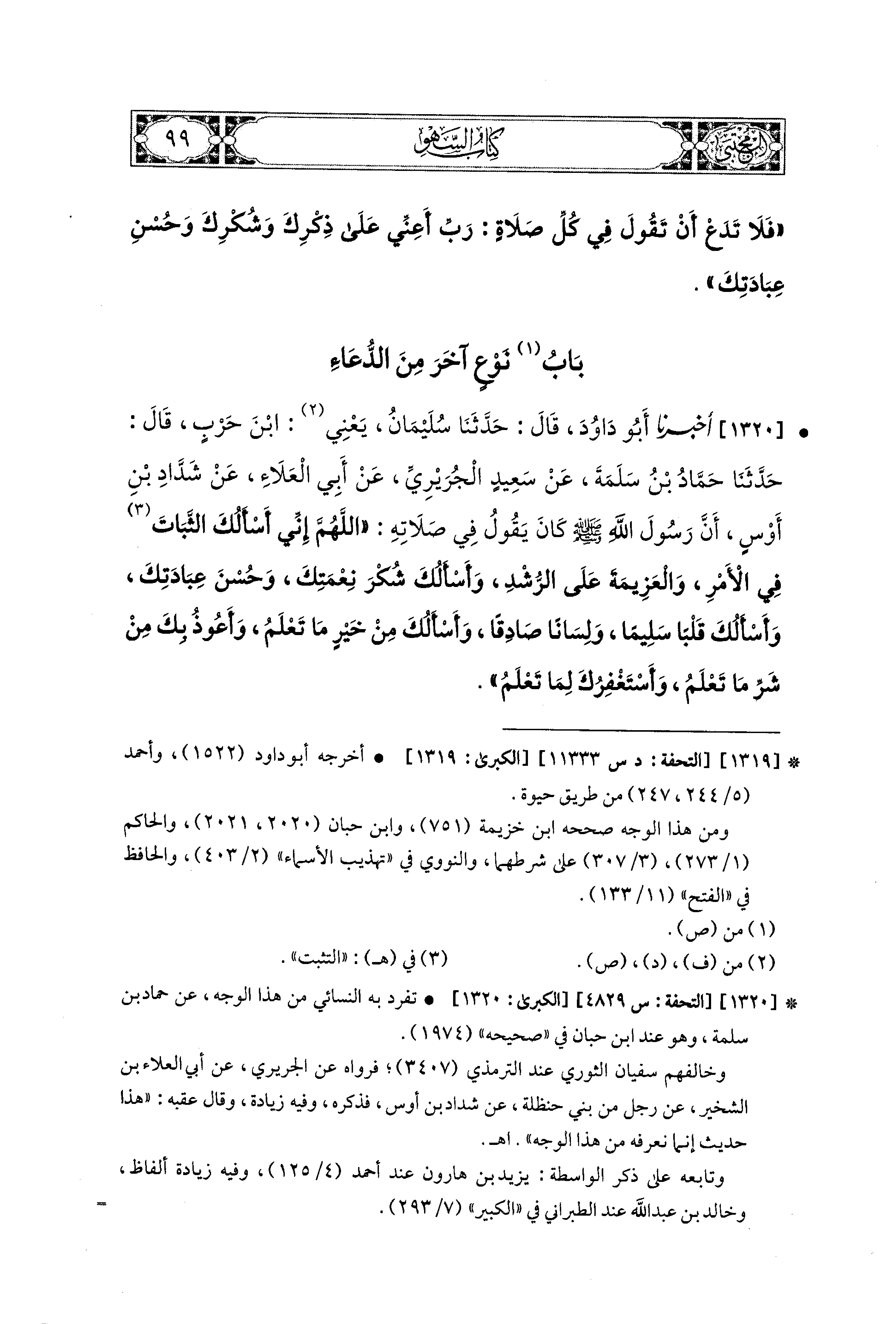 1283- أَخبَرَنا سُوَيْدُ بنُ نَصْرٍ، قَالَ: أَخبَرنا عَبدُ اللهِ يَعْني ابْنُ المُبَارَكِ، عَن زَائِدَةَ، قال: حَدثنا عَاصِمُ بنُ كُلَيْبٍ، قَالَ: حَدَّثَني أَبِي، أَنَّ وَائِلَ بْنَ حُجْرٍ قَالَ: قُلْتُ: لأَنْظُرَنَّ إِلَى رَسُولِ اللهِ صَلى الله عَليه وسَلم كَيْفَ يُصَلِّي؟ فَنَظَرْتُ إِلَيْهِ فَوَصَفَ، قَالَ: ثُمَّ قَعَدَ وَافْتَرَشَ رِجْلَهُ اليُسْرَى، وَوَضَعَ كَفَّهُ اليُسْرَى عَلَى فَخِذِهِ وَرُكْبَتِهِ اليُسْرَى، وَجَعَلَ حَدَّ مِرْفَقِهِ الأَيْمَنِ عَلَى فَخِذِهِ اليُمْنَى، ثُمَّ قَبَضَ اثْنَتَيْنِ مِنْ أَصَابِعِهِ، وَحَلَّقَ حَلْقَةً، ثُمَّ رَفَعَ أصْبَعَهُ فَرَأَيْتُهُ يُحَرِّكُهَا يَدْعُو بِهَا، مُخْتَصَرٌ.