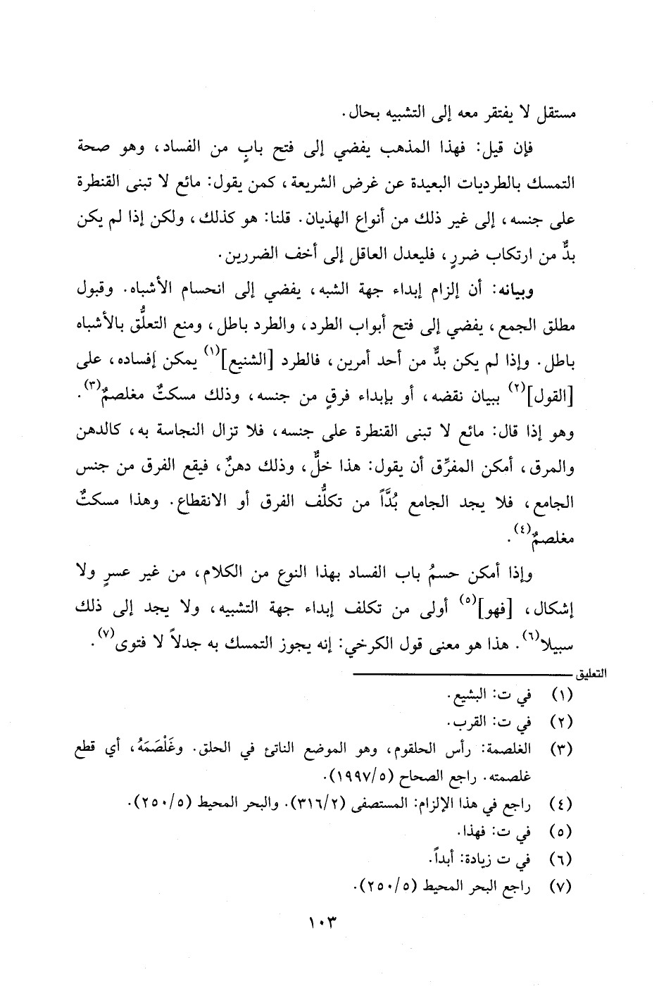 وإذا أمكن حسم باب الفساد بهذا النوع من الكلام، من غير عسرٍ ولا إشكال، [فهو] أولى من تكلف إبداء جهة التشبيه، ولا يجد إلى ذلك سبيلًا. هذا هو معنى قول الكرخي: أنه يجوز التمسك به جدلًا لا فتوى.
