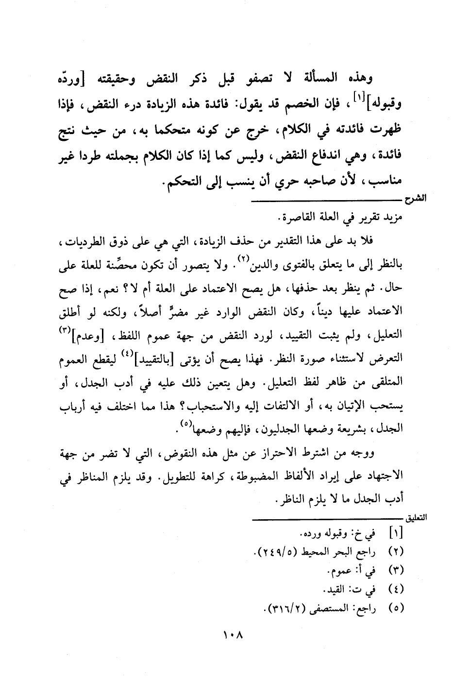 فلابد على هذا التقدير من حذف الزيادة، التي هي على ذوق الطرديات، بالنظر إلى ما يتعلق بالفتوى والدين. ولا يتصور أن تكون محصنة للعلة على حال. ثم ينظر بعد حذفها، هل يصح الاعتماد على العلة أم لا؟ نعم، إن صح الاعتماد عليها دينًا، وكان النقض الوارد غير مضرٍّ أصلًا، ولكنه لو أطلق التعليل، ولم يثبت التقييد، لورد النقض من جهة عموم اللفظ، [وعدم] التعرض لاستثناء صورة النظر. فهذا يصح أن يؤتى [بالتقييد] ليقطع العموم المتلقى من ظاهر لفظ التعليل. وهل يتعين ذلك عليه في أدب الجدل، أو يستحب الإتيان به، أو الالتفات إليه والاستحباب؟ هذا مما اختلف فيه أرباب الجدل، بشرعية وضعها الجدليون، فإليهم وضعها.
