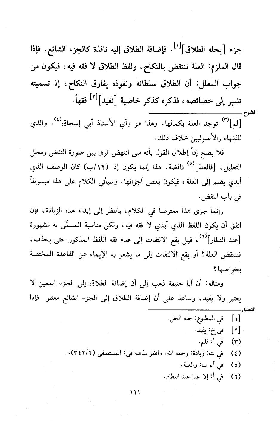ومثاله: أنا أبا حنيفة ذهب إلى أن إضافة الطلاق إلى الجزء المعين لا يعتبر ولا يفيد، وساعد على أن إضافة الطلاق إلى الجزء الشائع معتبر. فإذا