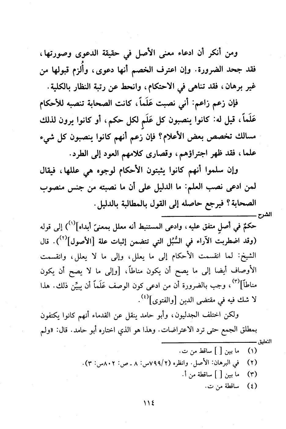 حكمٌ في أصلٍ متفق عليه، وادعى المستنبط أنه معلل بمعنىً أبداه] إلى قوله (وقد اضطربت الآراء في السبل التي تتضمن إثبات علة [الأصول]). قال الشيخ: لما انقسمت الأحكام إلى ما يعلل، وإلى ما لا يعلل، وانقسمت الأوصاف أيضًا إلى ما يصح أن يكون مناطًا، [وإلى ما لا يصح أن يكون مناطًا]، وجب بالضرورة أن من ادعى كون الوصف علمًا أن يبين ذلك. هذا لا شك فيه في مقتضى الدين [والفتوى].