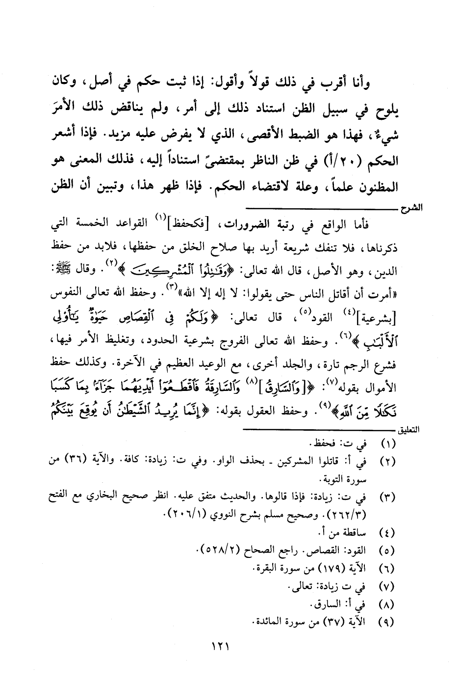 فأما الواقع في رتبة الضرورات، [فكحفظ] القواعد الخمسة التي ذكرناها، فلا تنفك شريعة أريد بها صلاح الخلق من حفظها، فلابد من حفظ الدين، وهو الأصل، قال الله تعالى: {وقاتلوا المشركين}. وقال - صلى الله عليه وسلم -: (أمرت أن أقاتل الناس حتى يقولوا: لا إله إلا الله). وحفظ الله تعالى النفوس [بشرعية] القود، قال الله تعالى: {ولكم في القصاص حياة يا أولى الألباب}. وحفظ الله تعالى الفروج بشرعية الحدود، وتغليظ الأمر فيها، فشرع الرجم تارة، والجلد أخرى، مع الوعيد العظيم في الآخرة. وكذلك حفظ الأموال بقوله: {[والسارق] والسارقة فاقطعوا أيديهما جزاء بما كسبا نكالًا من الله}. وحفظ العقول بقوله {إنما يريد الشيطان أن يوقع بينكم