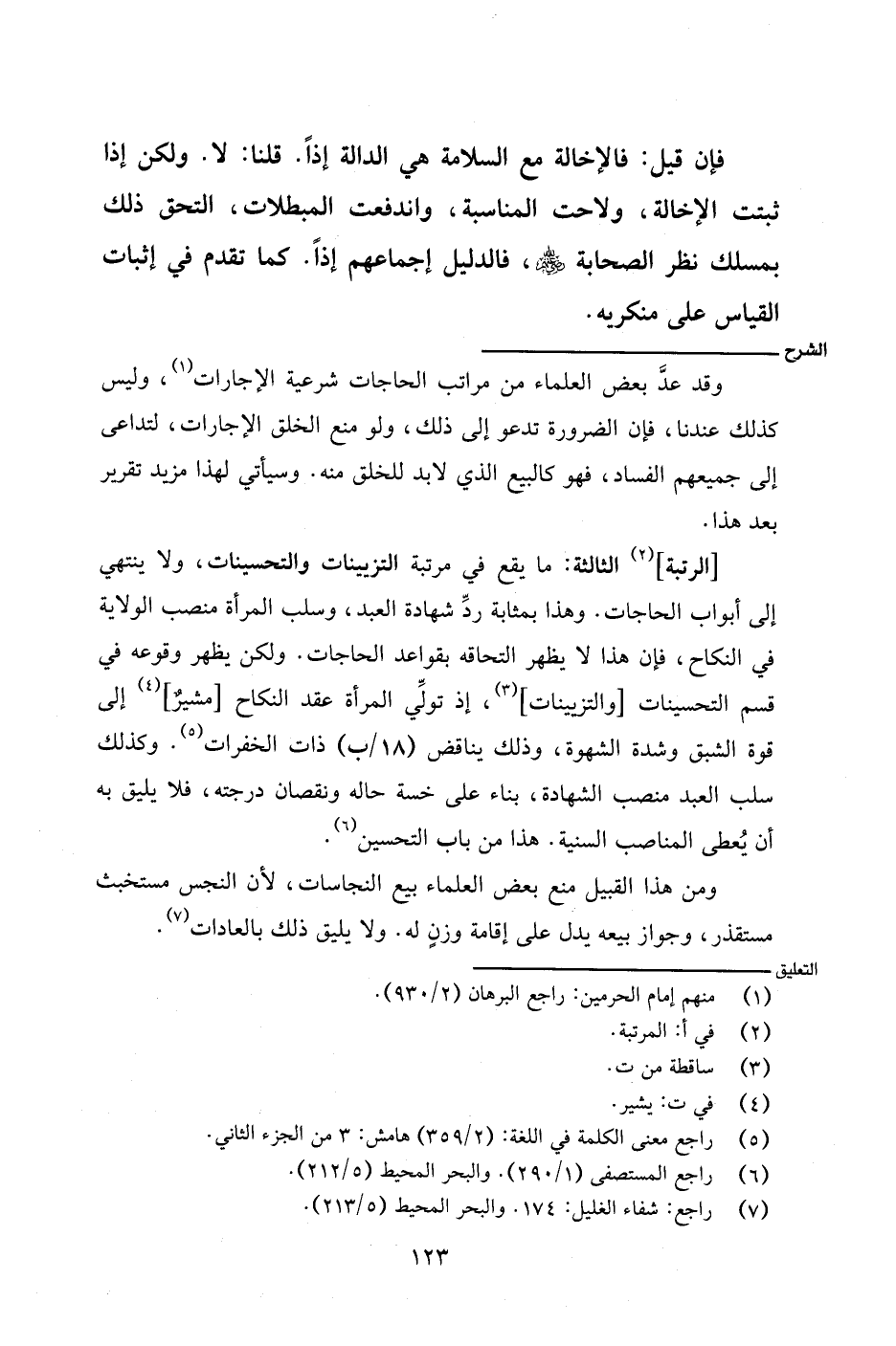 [الرتبة] الثالثة: ما يقع في مرتبة التزيينات والتحسينات، ولا ينتهي إلى أبواب الحاجات. وهذا بمثابة رد شهادة العبد، وسلب المرأة منصب الولاية في النكاح، فإن هذا لا يظهر التحاقه بقواعد الحاجات. ولكن يظهر وقوعه في قسم التحسينات [والتزيينات]، إذ تولي المرأة عقد النكاح [مشيرٌ] إلى قوة الشبق وشدة الشهوة، وذلك يناقض (١٨/ب) ذات الخفرات. وكذلك سلب العبد منصب الشهادة، بناء على خسة حاله ونقصان درجته، فلا يليق به أن يعطى المناصب السنية. هذا من باب التحسين.