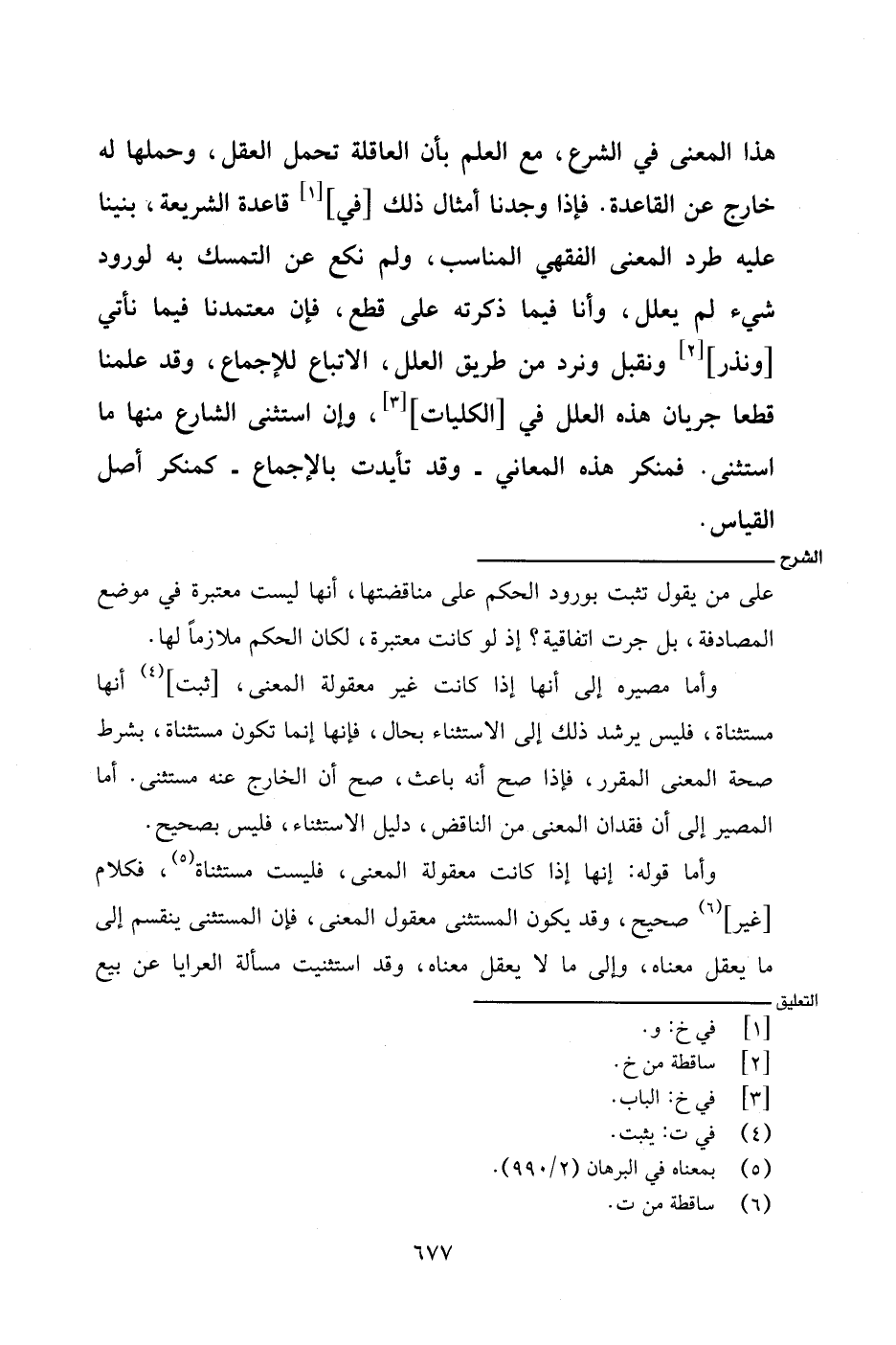 وأما مصيره إلى أنها إذا كانت غير معقولة المعنى، [ثبت] أنها مستثناة, فليس يرشد ذلك إلى الاستثناء بحال، فإنها إنما تكون مستثناة، بشرط صحة المعنى المقرر، فإذا صح أنه باعث، صح أن الخارج عنه مستثنى. أما المصير إلى أن فقدان المعنى من الناقض، دليل الاستثناء، فليس بصحيح.