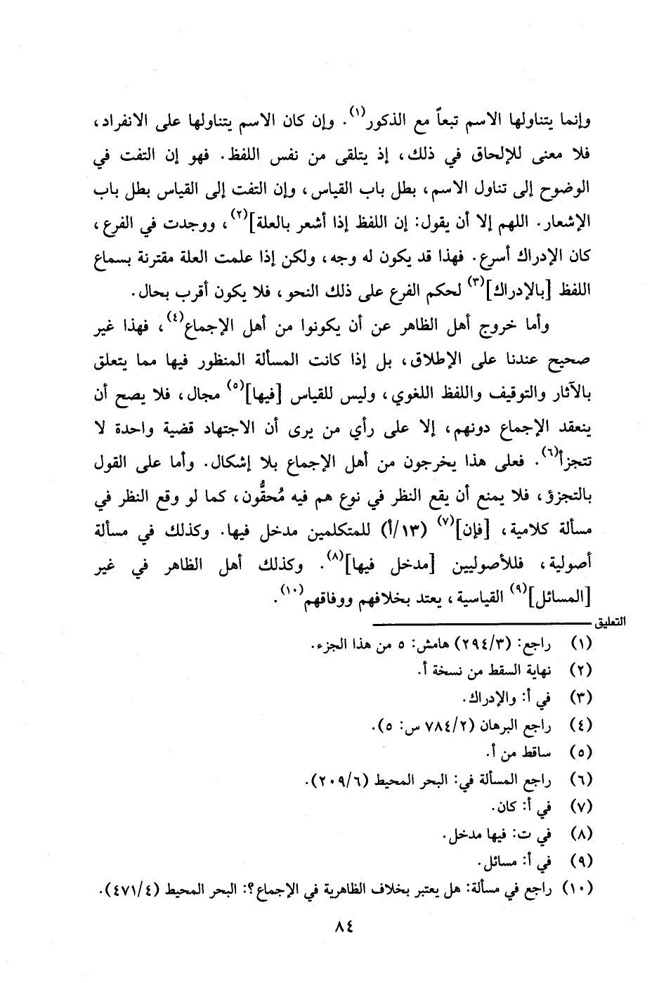 وأما خروج أهل الظاهر عن أن يكونوا من أهل الإجماع، فهذا غير صحيح عندنا على الإطلاق، بل إذا كانت المسألة المنظور فيها مما يتعلق بالآثار والتوقيف واللفظ اللغوي، وليس للقياس [فيها] مجال، فلا يصح أن ينعقد الإجماع دونهم، إلا على رأي من يرى أن الاجتهاد قضية واحدة لا تتجزأ. فعلى هذا يخرجون من أهل الإجماع بلا إشكال. وأما على القول بالتجزؤ، فلا يمنع أن يقع النظر في نوع هم فيه محقون، كما لو وقع النظر في مسألة كلامية، [فإن] (١٣/أ) للمتكلمين مدخل فيها. وكذلك في مسألة أصولية، فللأصوليين [مدخل فيها]. وكذلك أهل الظاهر في غير [المسائل] القياسية، يعتد بخلافهم ووفاقهم.