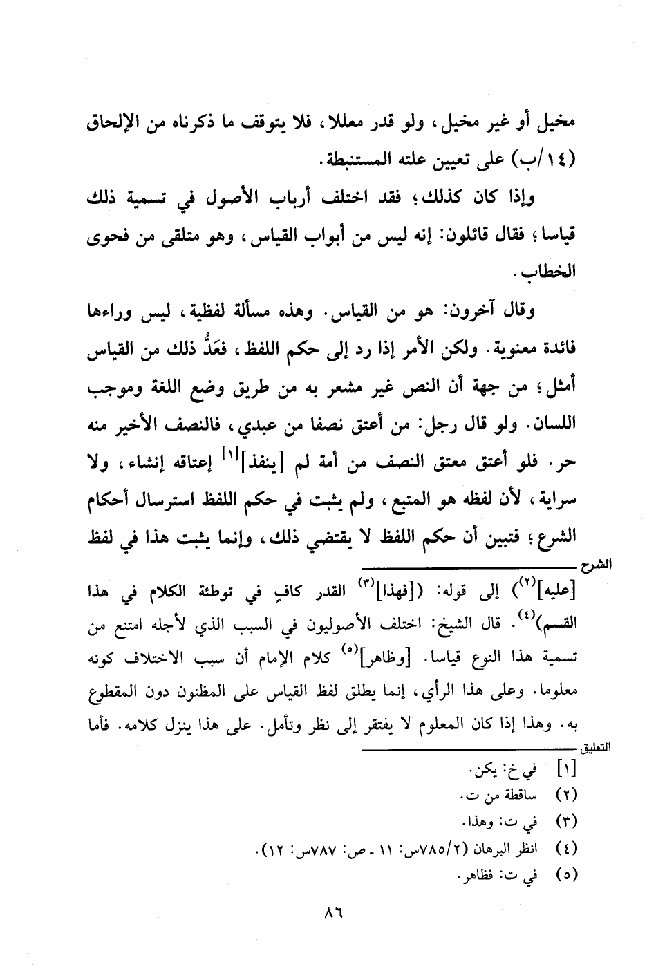 [عليه]) إلى قوله: ([فهذا] القدر كافٍ في توطئة الكلام في هذا القسم). قال الشيخ: اختلف الأصوليون في السبب الذي لأجله امتنع من تسمية هذا النوع قياسًا. [وظاهر] كلام الإمام أن سبب الاختلاف كونه معلومًا. وعلى هذا الرأي، إنما يطلق لفظ القياس على المظنون دون المقطوع به. وهذا إذا كان المعلوم لا يفتقر إلى نظر وتأمل. على هذا ينزل كلامه. فأما